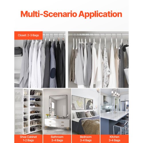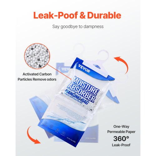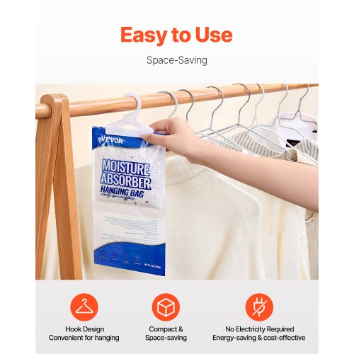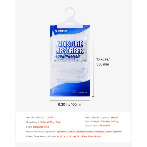 VEVOR Hanging Moisture Absorber, 9.3 oz Hanging Closet Dehumidifier Bags(10 Packs), Fragrance Free Moisture Bags in Wardrobes, Bedrooms, BathroomsPowerful Moisture AbsorptionVisible EffectAir FresheningSimple OperationWide ApplicationConvenient DesignGross Weight: 9.3 oz / 265 g / Pack,Item Model Number: LX-001,Product Weight: 5.84 lbs / 2.65 kg,Style: Disposable,Water Collection Capacity: 500 ml,Scent: Fragrance-Free,Product Dimensions (L x W x H): 6.30'' x 13.78'' x 0.79'' / 160 x 350 x 20 mm