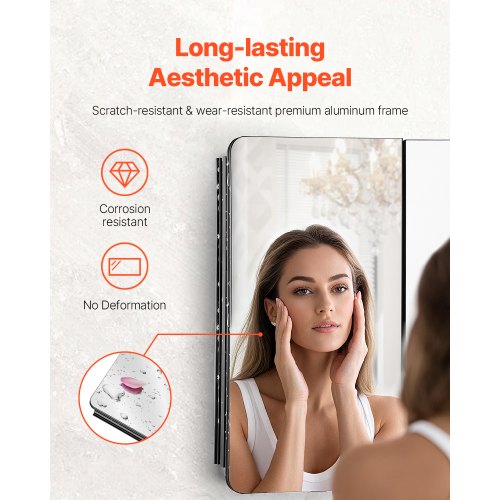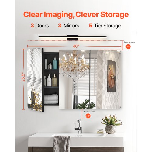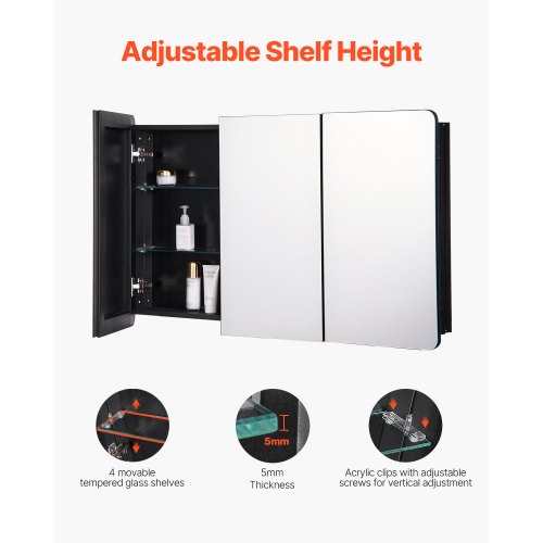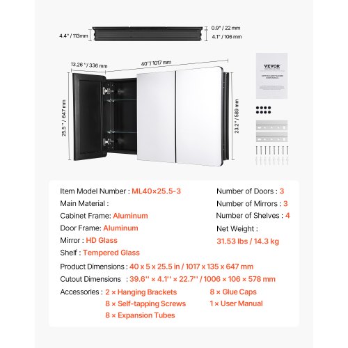 Medicine Cabinet 25.5" x 40" Mirror Medicine Cabinet Adjustable ShelvesMulti-Functional Bathroom Medicine CabinetAdjustable ShelvesBuilt to Withstand HumidityFlexible InstallationThoughtful DesignTriple Mirror DesignNumber of Shelves: 2,Materials:,Cabinet Frame: Aluminum Profile (6063),Item Model Number: ML40×25.5-3,Shelf: Tempered Glass,Number of Doors: 3,Door Frame: Aluminum Profile (6063),Product Dimensions: 40 x 5 x 25.5 in / 1017 x 135 x 647 mm,Mirror: HD Glass,Net Weight: 31.53 lbs / 14.3 kg,Number of Mirrors: 3