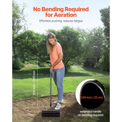 VEVOR Rolling Lawn Aerator, 18-inch Heavy-Duty Manual Rolling Aerator Lawn with Detachable Handle and 27 Iron Spikes, Rolling Lawn Aeration Tool for Garden Patio Yard Compacted Soils and Lawns, BlackEasy to UseBoost Plant VitalityQuick AerationComplete AccessoriesVersatile ApplicationUser-Friendly DesignHandle Length: 51.57 inch / 131 cm,Spike Length: 2 inch / 50.8 mm,Color: Black,Item Model Number: LA38New-SYT,Aeration Width: 18 inch / 457.2 mm,Bucket Size: Ø5.51 inch / 14 cm,Number of Spikes: 27,Material: Iron + Powder Coated Surface,Product Dimensions (L x W x H): 17.13 x 9.25 x 61.42 inch / 435 x 235 x 1560 mm,Net Weight: 10.03 lbs / 4.55 kg,Main Material: Metal