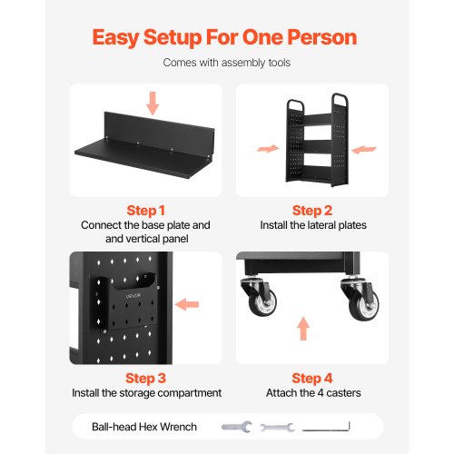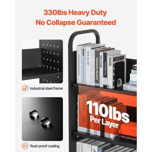 VEVOR 3-Tier Rolling Book Cart Single Sided L-Shaped Shelves Book Truck in Black3-in-1 Multifunctional Book CartSecure Heavy LoadQuiet OperationPremium MaterialMaximized SpaceUser-friendly DesignWeight Capacity: 110 lbs / 50 kg (1 Shelf); 330 lbs / 150 kg (3 Shelves),Item Model Number: HXTC-3LD,Product Dimensions: 30.3 x 15 x 48.0 in / 770 x 380 x 1220 mm,Net Weight: 41.67 lbs / 18.9 kg (including all accessories),Main Material: Carbon Steel & Cold Rolled Steel