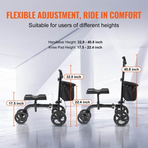 VEVOR Folding Knee Scooter, Carbon Steel Steerable Knee Walker with Height-Adjustable Handlebar & Knee Pad, All-Terrain Solid Wheels, Dual Brakes, Leg Recovery Scooter for Broken Ankle Foot InjuriesHigh Quality Solid All-Terrain WheelsComfortable PU Knee PadEasy-To-Use Dual Brake SystemYour Perfect Mobility CompanionNavigate Indoors and Outdoors with EaseErgonomic Design for All-Day ComfortWheel Size: 10 inch Front Wheels, 8 inch Rear Wheels,Color: Black,Item Model Number: HFK-9270,Maximum Load Capacity: 300 lbs / 136 kg,Handlebar Height: 32.9 - 40.8 inch / 835 - 1036 mm,Product Dimensions: 35.8 x 16.9 x 40.8 in / 910 x 430 x 1036 mm,Net Weight: 22.7 lbs / 10.3 kg,Main Material: Carbon Steel,Knee Pad Height: 17.5 - 22.4 inch / 445 - 570 mm
