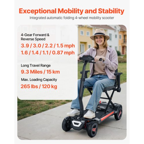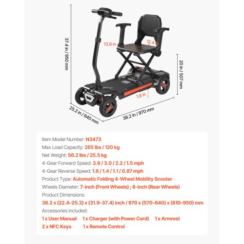 VEVOR 4-Wheel Electric Mobility Scooter Auto Folding Scooter with Remote Control<br/>Large Flat-Free Tires<br/>Safety Brake System<br/>Telescopic Handle<br/>Versatile Applications<br/>Go Further, Explore More<br/>High Weight Capacity<br/>Travel Range: 9.3 Miles / 15 km,Climbing Angle: ≤9°,Product Type: Automatic Folding 4-Wheel Mobility Scooter,Color: Black,Item Model Number: N3473,Wheels Diameter: 7-inch (Front Wheels) ; 8-inch (Rear Wheels) ,Max Load Capacity: 265 lbs / 120 kg,4-Gear Reverse Speed: 1.6 / 1.4 / 1.1 / 0.87 mph,Product Dimensions: 38.2 x (22.4–25.2) x (31.9–37.4) inch / 970 x (570–640) x (810–950) mm,Net Weight: 56.2 lbs / 25.5 kg,4-Gear Forward Speed: 3.9 / 3.0 / 2.2 / 1.5 mph