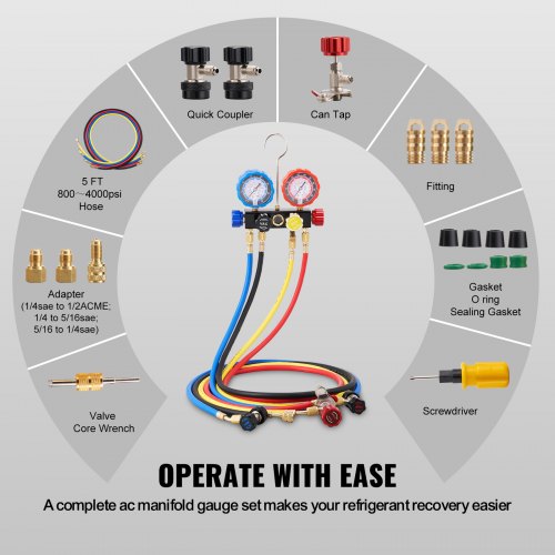 VEVOR 4 Way AC Gauge - AC Manifold Gauge Set for R134A R22 R12 R410A Refrigerant, Freon Gauges with 5ft Hoses, Couplers, Can Tap Works on Car Auto Freon Charging and EvacuationCompatible with Most EquipmentMove on the GoDouble Precision Accuracy5 ft Extra Long HoseEasy to OperateWork TogetherService Life: 2 Years,Type: 4-Way Manifold Gauge Set,Measuring Range: -30~800psi (high pressure gauge) - 30~500psi (low pressure gauge),Item Model Number: WZ--J401,Product Weight: 6.8 lbs/3.08 kg,Purpose: Fill refrigerant and test air conditioning system,Material: Brass, Aluminum 6061-T5,Accuracy Class: ±1.6,Product Size: 12.2 x 11.8 x 3.35 inch/31 x 30 x 8.5 cm