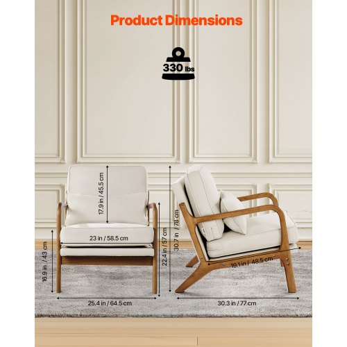 Mid-Century Modern Accent Chair Linen Fabric Armchair with 5.7 in CushionWooden Accent ChairErgonomic DesignPremium MaterialsSturdy and DurableVersatile DesignThoughtful DesignBack Height: 17.9 in / 45.5 cm,Weight Capacity: 330 lbs / 150 kg,Seat Cushion Thickness: 5.7 in / 14.5 cm,Color: Brown + Beige,Seat Dimensions (WxDxH): 23.0 x 19.1 x 16.9 in / 58.5 x 48.5 x 43 cm,Item Model Number: SL2325-1A,Set Includes: 1 Piece,Material: Rubberwood + Linen Fabric,Net Weight: 27.7 lbs / 12.55 kg,Product Dimensions (WxDxH): 25.4 x 30.3 x 30.7 in / 64.5 x 77 x 78 cm,Armrest Height: 22.4 in / 57 cm