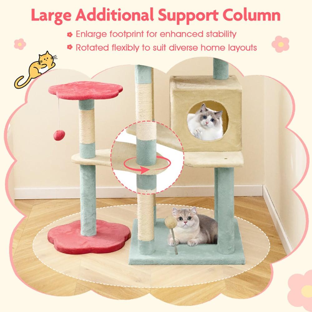 ● Stable and Reliable Structure: The flower cat tree boasts a large additional support column that enlarges the footprint for enhanced stability, preventing any wobbling when cats jump up and down. Furthermore, it can be rotated flexibly to suit diverse home layouts.