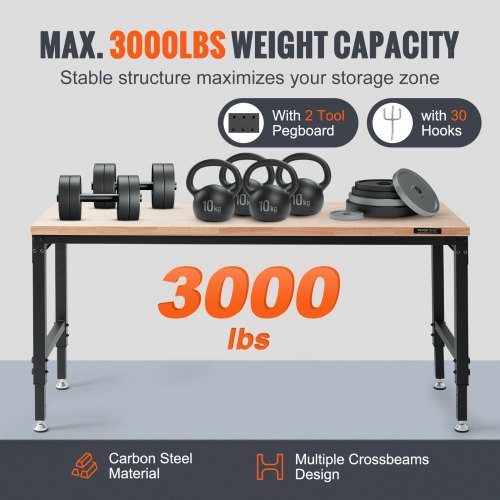 VEVOR Adjustable Workbench, 72" L X 25" W Garage Worktable with Universal Wheels, 28-39.5" Heights & 3000 LBS Load Capacity, with Power Outlets & Hardwood Top & Storage & Foot Pads, for Office HomeUniversal WheelsRubber FeetSolid Wood DesktopMultifunctional SocketsHeight AdjustablePowerful StorageAdjustment Holes: 10,Certification: ETL Certification,Desktop Material: Oak Plank,Bench top Size: 72 x 25 in / 1829 x 635 mm ± 3 mm,Weight Capacity: 3000 lbs / 1361 kg,Height Range: 28-39.5 in / 71.1-100.3 cm,Voltage: 125 V / 60 Hz,Model: SHFGM7225,Product Weight: 48.3 kg / 106.5 lbs,Frame Material: Carbon Steel,Cable Length: 9.8 ft / 3 m,Current: 15 A,Bench top Thickness: 1.5 in / 38 mm ± 1 mm