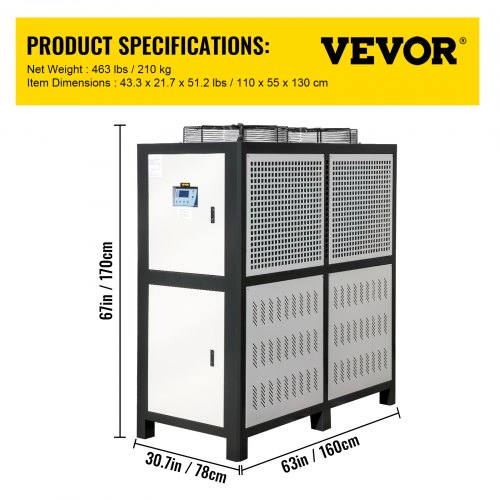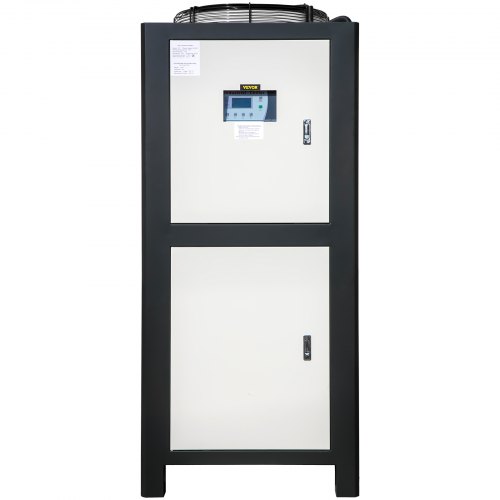 VEVOR Water Chiller 15Ton, Capacity Industrial Chiller 15Hp, Air-Cooled Water Chiller, Finned Condenser, w/ Micro-Computer Control, Stainless Steel Water Tank Chiller Machine for Cooling WaterLow Consumption MotorProfessional Finned CondenserSmart Protection SystemPrecise LED ScreenEffortless Setup & OperationBuilt-in Water PumpFan Motor Power: 0.64KW,Item Dimensions (L x W x H): 63 x 30.7 x 67 in / 160 x 78 x 170 cm,Condensation temperature: 45℃,Coolant Type: R407,Pump Power: 2.2KW,Compressor Motor Power: 15HP / 11.25KW,Heat Exchange Tube Material: Copper,Cooling Capacity: 45KW / 38700Kcal/h,Compressor type: Fully Enclosed Vortex,Tank Capacity: 150L,Pump Motor Power: 2HP,Regulate Temperature: 5℃ - 25℃,Net Weight: 1345 lbs / 610 kg,Power: 220V / 60Hz / 3P