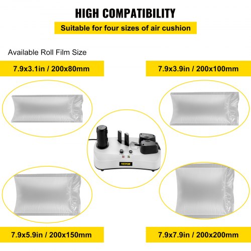 VEVOR Air Cushion Machine, Sealing Speed 7.2-7.8 ft/min Air Pillow Machine, 110V Air Pillow Packaging Machine, Portable Air Cushion Wrap Machine for Inflatable Packaging+164 ft/50 m Test Film Roll7.8 ft/min Sealing SpeedAdjustable Air DensityMax 7.9" Strong AdaptabilityEasy Blade ReplacementCompact SizeExtensive UsesMachine Size(L x W x H): 13 x 6 x 7 in / 33 x 15 x 17 cm,Warm-Up Time: 4 Minutes,Sealing Speed: 7.2-7.8 ft/min(2.2-2.4 m/min),Voltage: 110V,Max. Film Width Used: 7.9 in / 200 mm,Model: YE330,Max. Film Length Used: 7.9 in / 200 mm,Net Weight: 4.2 lbs / 1.9 kg,Power: 100W
