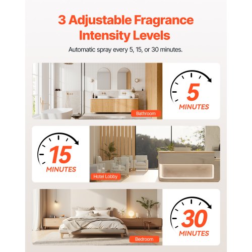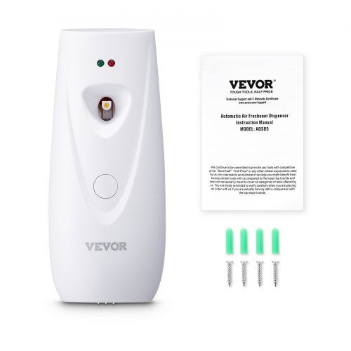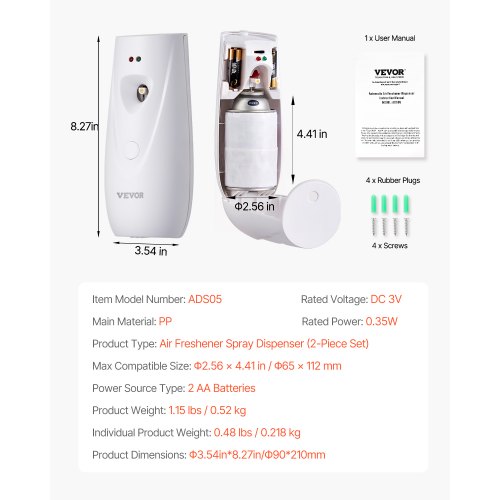 VEVOR Automatic Air Freshener Spray Dispenser, 2-Pack, Wall Mounted or Free Standing, Battery Operated, Multiple Time Settings for Home, Indoor, Bathrooms, Offices, Hotels, Commercial Places, White2-Piece Air Freshener Dispenser SetCompatible with Various Fragrance CansCustomizable Timed Sprays All Day LongInstantly Neutralize SmellsFit for Any SpaceStylish and Space-Saving DesignMax Compatible Size: Φ2.56 x 4.41 in / Φ65 x 112 mm,Product Type: Air Freshener Spray Dispenser (2-Piece Set),Item Model Number: ADS05,Product Weight: 1.15 lbs / 0.52 kg,Rated Power: 0.35W,Power Source Type: 2 AA Batteries(NOT Included),Individual Product Weight: 0.48 lbs / 0.218 kg,Main Material: PP,Rated Voltage: DC 3V