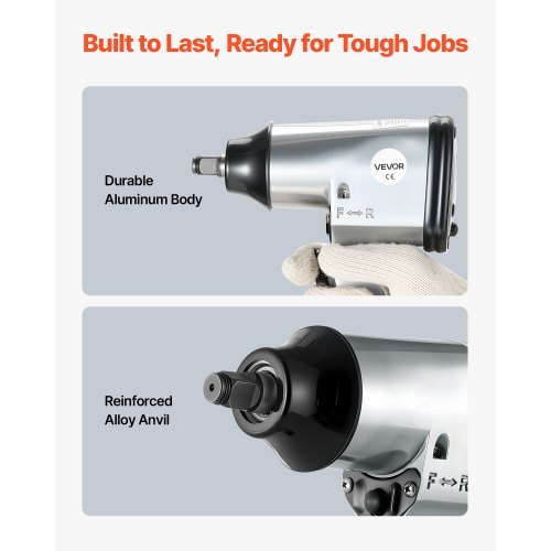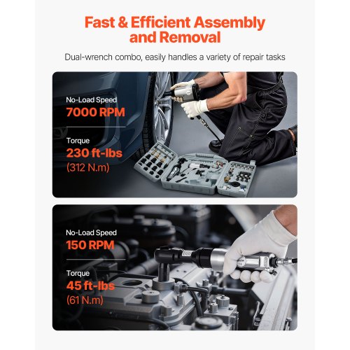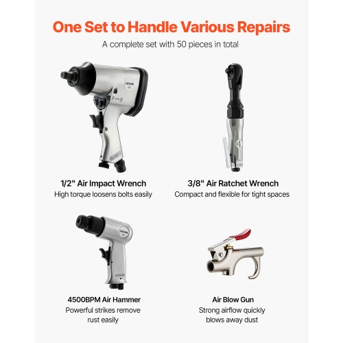 VEVOR 50pcs Pro Air Tool and Accessories Kit Air Impact & Ratchet Wrench Hammer<br/>Sturdy Carrying Case<br/>Aluminum Alloy Body<br/>Reinforced Alloy Anvil<br/>One Set Covers All Needs<br/>High Torque, High Efficiency<br/>Comfortable Operation<br/>1/2" Air Impact Wrench: 230 ft-lbs; 7000 rpm,Toolbox Dimensions: 15.75 x 13.39 x 4.13 in / 400 x 340 x 105 mm,Air Hammer: 4500 BPM,3/8" Air Ratchet Wrench: 45 ft-lbs ; 150 RPM,Item Model Numbber: WF-009,Net Weight: 16.31 lbs / 7.4 kg