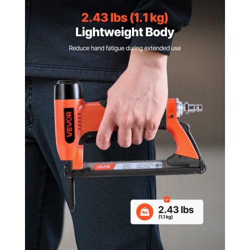 VEVOR Pneumatic Staple Gun, 20 Gauge Long-Nose Upholstery Stapler for 50 Series Fine Wire Staples 1/2-inch Crown 1/4"-5/8" Length, Max 110PCS Loading Air Staple Gun for Upholstering, Woodworking, DIY<br/>Lightweight Body<br/>Large Loading Capacity<br/>More Details<br/>Multi-Purpose Uses<br/>Durable Material<br/>Wide Applications<br/>Operating Pressure: 70 - 100 PSI,Staple Gun Type: 20-Gauge,Compatible Staple Length: 1/4 - 5/8 inch,Magazine Capacity: Max 110PCS,Item Model Number: MT5016SLN,Compatible Crown Width: 1/2 inch,Air Inlet Size: 1/4" NPT,Compatible Staples: 50 Series Fine Wire Staples,Product Dimensions: 8.66 x 7.48 x 1.77 inch / 220 x 190 x 45 mm,Net Weight: 2.43 lbs / 1.1 kg,Main Material: Aluminum Alloy