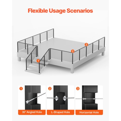 VEVOR 4-Pack Cable Railing Post, 42x1x2 In Horizontal-Hole Deck Railing Post with Pre-Drilled Holes, Stainless Steel Cable Rail Post with Horizontal and Curved Bracket, Black, 4JZLGZXHS106REP67001V0Horizontal Hole Railing Post4 Thoughtful HighlightsEasy to InstallFlat and Curved SupportsMulti-Scene ProtectionBuilding Code-Compliant SpacingNumber of Holes: 12,Net Weight(Include Accessories): 19.62 Ibs/8.9kg (±3%),Color: Black,Item Model Number: HR-003,Quantity: 4,Railing Post Spacing: Suitable for up to 4ft,Main Material: SUS304 Stainless Steel