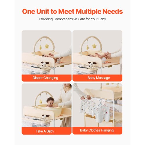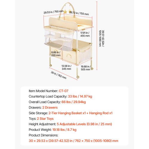 VEVOR Baby Changing Table, Foldable Diaper Change Station with 2 Fabric Drawers, Side Basket & Hanging Rod, Adjustable Height Portable Changing Table with Lockable Wheels & 2 Star Toys, Light BeigePortable Folding DesignSpacious StorageReliable QualityMulti-Function Design360° Security ProtectionHeight Adjustment: 5 Adjustable Levels (0.98 in / 25 mm),Toys: 2 Star Toys,Weight Capacity: 66 lbs / 29.94 kg,Side Storage: 2-Tier Hanging Basket x1 + Hanging Rod x1,Item Model Number: CT-07,Product Weight: 19.18 lbs / 8.70 kg,Drawers: 2 Drawers,Product Dimensions: 30.00 x 29.53 x (39.57-42.52) in / 762 x 750 x (1005-1080) mm