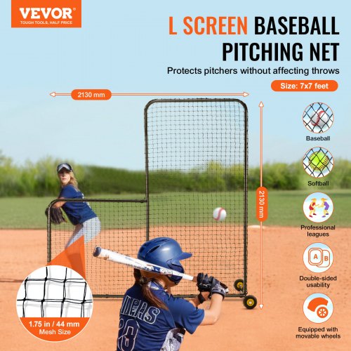 VEVOR L Screen Baseball for Batting Cage, 7x7 ft Softball Safety Screen, Body Protector Portable Batting Screen with Carry Bag, Wheels, Ground Stakes, Heavy Duty Pitching Net for Pitchers ProtectionEnsuring Pitcher SafetySturdy NettingDurable Steel Pipe MaterialPortableVersatile ApplicationA Great AssistantIron Pipe Diameter: 1.26 inch / φ32 mm,Iron Pipe Wall Thickness: 0.047 inch / 1.2 mm,Item Size: 83.86x41.73x83.86 inch / 2130x1060x2130 mm,Item Model Number: XH-SH-7X7-L,Product Weight: 25.35 lbs / 11.5 kg,Main Material: PE Net