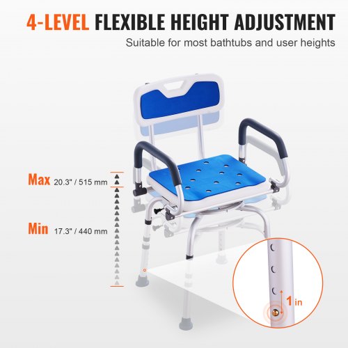 VEVOR Shower Chair 360° Swivel Bathtub Shower Seat with Pivoting Arms 400LBSAdjustable HeightHigh Weight CapacityComfortable SeatEasy InstallationStrong StabilityVersatile Bath AssistantAt Lowest Level: 20.9 x 20.5 x 29.9 in / 530 x 520 x 760 mm,Height Adjustment: 4 Levels,Backrest Dimensions: 16.1 x 6.5 x 1.1 in / 410 x 165 x 29 mm,Seat Plate Dimensions: 15.9 x 13.4 x 1.7 in / 405 x 340 x 43 mm,Item Model Number: FBL650326,Maximum Load Capacity: 400 lbs / 180 kg,Product Weight: 10.0 lbs / 4.53 kg,At Highest Level: 20.9 x 20.5 x 32.9 in / 530 x 520 x 835 mm,Product Dimensions:,Main Material: Aluminum Alloy #6063, PE, EVA,Seat Plate Height: 17.3 - 20.3 in / 440 - 515 mm