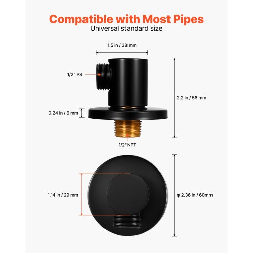 VEVOR Wall Mounted Supply Elbow Brass Round Wall Supply Elbow Matte Black<br/>Stable Water Flow<br/>Strong and Durable<br/>Enhanced Rust Resistance<br/>Easy Installation<br/>Sleek and Stylish<br/>Heavy Duty Design<br/>Color: Matte Black,Inner Hole Dimensions: φ 0.87 inch / 22 mm,Item Model Number: SZ331,Outlet Type: 1/2 IPS,Valve Body Dimensions: 2.2 x 1.5 x 1.14 inch / 56 x 38 x 29 mm,Shutter Dimensions: φ 2.36 x 0.24 inch / 60 x 6 mm,Net Weight: 0.3 lbs / 136.4 g,Inlet Type: 1/2 NPT,Main Material: Brass, 201 Stainless Steel