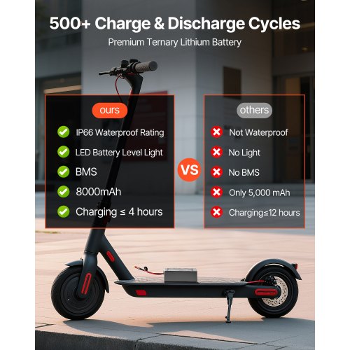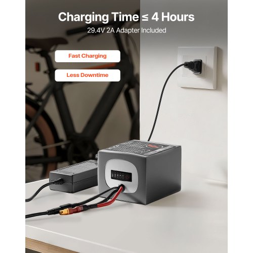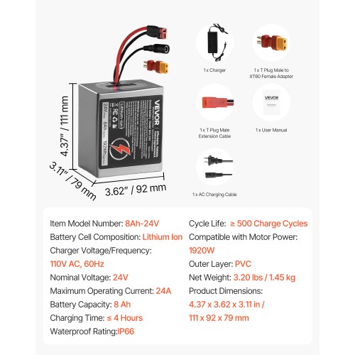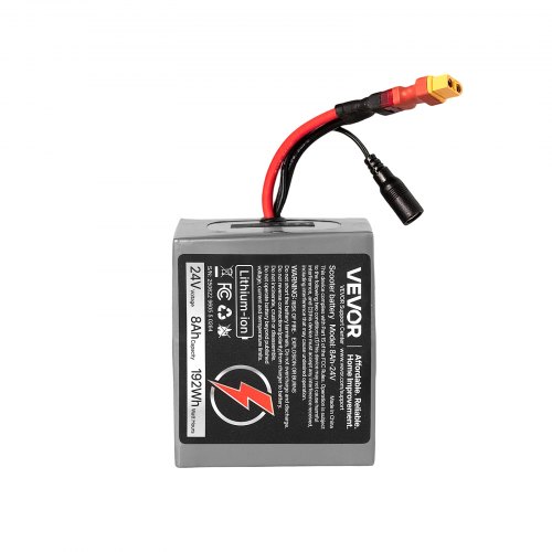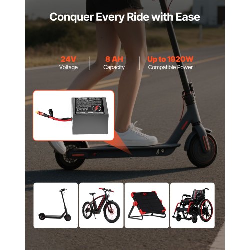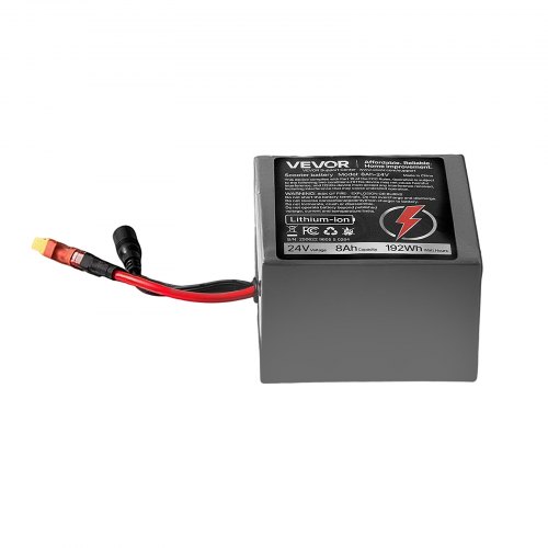 VEVOR 24V Electric Scooter Battery 8Ah Ebike Lithium Battery Pack with 30A BMS<br/>Power that Lasts<br/>Reliable Multi-Layer Protection<br/>All-Weather Performance<br/>Hassle-Free Operation<br/>Wide Compatibility<br/>Lightweight & Portable<br/>Charger Voltage/Frequency: 110V AC, 60Hz,Cycle Life: ≥ 500 Charge Cycles,Maximum Operating Current: 24A,Battery Capacity: 8 Ah,Waterproof Rating: IP66,Outer Layer: PVC,Item Model Number: 8Ah-24V,Nominal Voltage: 24V,Battery Cell Composition: Lithium Ion,Compatible with Motor Power: 1920W,Charging Time: ≤ 4 Hours