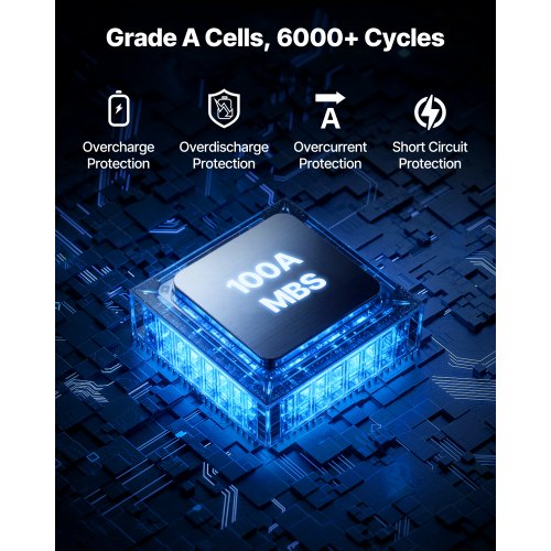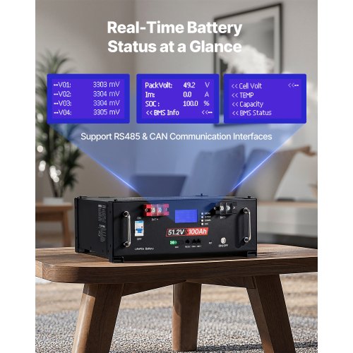 VEVOR 48V 100Ah LiFePO4 Lithium Battery 51.2V Server Rack Battery with 100A BMS<br/>RS485 & CAN Ports<br/>LCD Display<br/>Circuit Breaker<br/>Multiple Communication Options<br/>Flexible Charging Methods<br/>Wide Application<br/>Cycle Life: > 6000 Cycles,Operating Temperature: 77℉/25℃,Capacity: 100Ah,Voltage: DC 51.2V,Item Model Number: LPS48100,Float Charge Voltage: 55.2V,Discharge Rate: 1C,Max Charge/Discharge Current: 100A