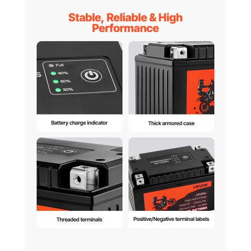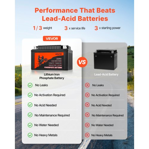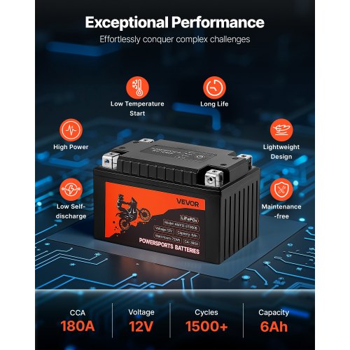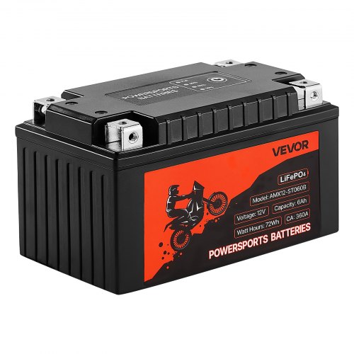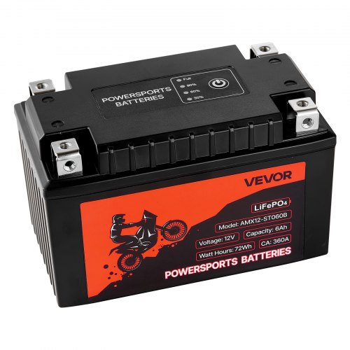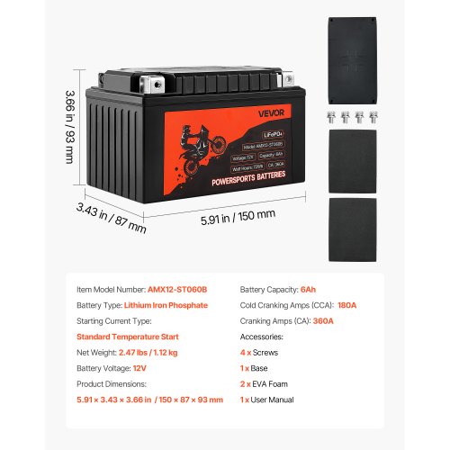 VEVOR Motorcycle Battery 12V 6Ah YTX12-BS High Performance Powersports Battery<br/>Powerful Performance & Long Battery Life<br/>Efficient & Stable<br/>Easy Installation & Universal Compatibility<br/>Versatile Use<br/>Customized to Your Needs<br/>Waterproof Performance<br/>Cranking Amps (CA): 360CA,Battery Capacity: 6Ah,Battery Voltage: 12V,Starting Current Type: Standard Temperature Start,Item Model Number: AMX12-ST060B,Cold Cranking Amps (CCA): 180CCA,Product Dimensions: 5.91 x 3.43 x 3.66 in / 150 x 87 x 93 mm,Battery Type: Lithium Iron Phosphate,Net Weight: 2.47 lbs / 1.12 kg