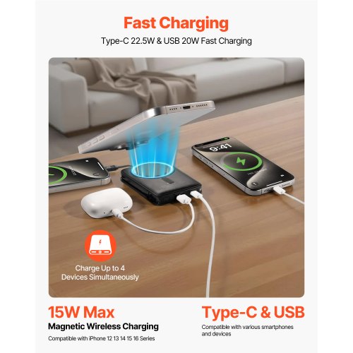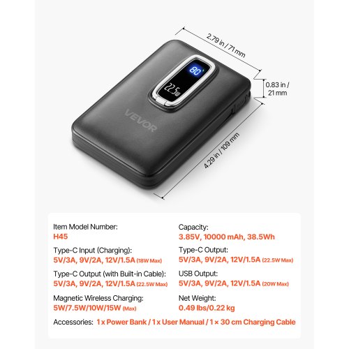 Magnetic Power Bank 10000 mAh Fast Charging Wireless Battery Charger LED Display<br/>3 Smart Charging Solutions<br/>Effortless Multi-Device Charging<br/>Flight-Approved<br/>Lightweight and Convenient<br/>Ready for Multiple Device Types<br/>Charge & Discharge Optimization<br/>USB Output: 5V/3A, 9V/2A, 12V/1.5A (20W Max),Type-C Output: 5V/3A, 9V/2A, 12V/1.5A (22.5W Max),Capacity: 3.85V, 10000 mAh, 38.5 Wh,Item Model Number: H45,Type-C Output (with Built-in Cable): 5V/3A, 9V/2A, 12V/1.5A (22.5W Max),Magnetic Wireless Charging: 5W/7.5W/10W/15W (Max),Product Dimensions: 4.29 x 2.79 x 0.83 in/109 x 71 x 21 mm,Type-C Input (Charging): 5V/3A, 9V/2A, 12V/1.5A (18W Max),Net Weight: 0.49 lbs/0.22 kg