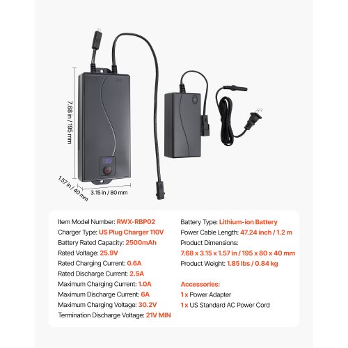 Battery Pack for Reclining Furniture 2500 mAh Battery Pack with AdapterLong-Lasting PowerAdaptable to Different ConditionsSmart Security DesignQuick Charging TechnologyLightweight & Easy to UseStable Power in Various SpacesMaximum Charging Voltage: 30.2V,Maximum Charging Current: 1.0A,Battery Rated Capacity: 2500mAh,Charger Type: US Plug Charger 110V,Maximum Discharge Current: 6A,Product Dimensions: 7.68 x 3.15 x 1.57 in / 195 x 80 x 40 mm,Rated Charging Current: 0.6A,Battery Type: Lithium-ion Battery,Rated Voltage: 25.9V,Power Cable Length: 47.24 inch / 1.2 m,Termination Discharge Voltage: 21V MIN,Item Model Number: RWX-RBP02,Product Weight: 1.85 lbs / 0.84 kg,Rated Discharge Current: 2.5A