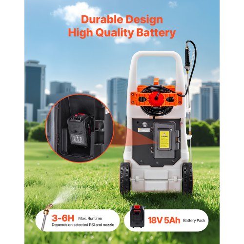 13.1Gal Battery Powered Sprayer with Cart Wheeled 0-80 PSI Electric Weed SprayerComplete AccessoriesWide Mouth LidPremium BatteryMulti-Purpose UseSmart, User-Focused DesignBeginner-Friendly OperationHose Specs: PVC braided hose, 30m length,Capacity: 50L (13.1 Gallons),Operating Voltage: DC18V,Pump Maximum Flow Rate: 4.0 ± 0.2 L/Min,Color: White + Orange,Item Model Number: KF-50C-2,Product Weight: 14.8 kg / 32.63 lb,Pump Output Pressure Range: 0-80 psi, stepless adjustable,Product Dimensions: 475 × 470 × 965 mm / 18.70 in × 18.50 in × 38.03 in
