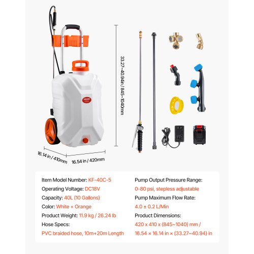 10 Gal Battery Powered Sprayer with Cart Wheeled 0-80 PSI Electric Weed Sprayer<br/>Complete Accessories<br/>Wide Mouth Lid<br/>Premium Battery<br/>Multi-Purpose Use<br/>Smart, User-Focused Design<br/>Beginner-Friendly Operation<br/>Hose Specs: PVC braided hose, 30m length,Capacity: 40L (10.5 Gallons),Operating Voltage: DC18V,Pump Maximum Flow Rate: 4.0 ± 0.2 L/Min,Color: White + Orange,Item Model Number: KF-40C-5,Product Weight: 12.6 kg / 27.78 lb,Pump Output Pressure Range: 0-80 psi, stepless adjustable,Product Dimensions (L x W x H): 470 × 420 × (860~1110) mm / 18.50 in × 16.54 in × (33.86 in ~ 43.70 in)