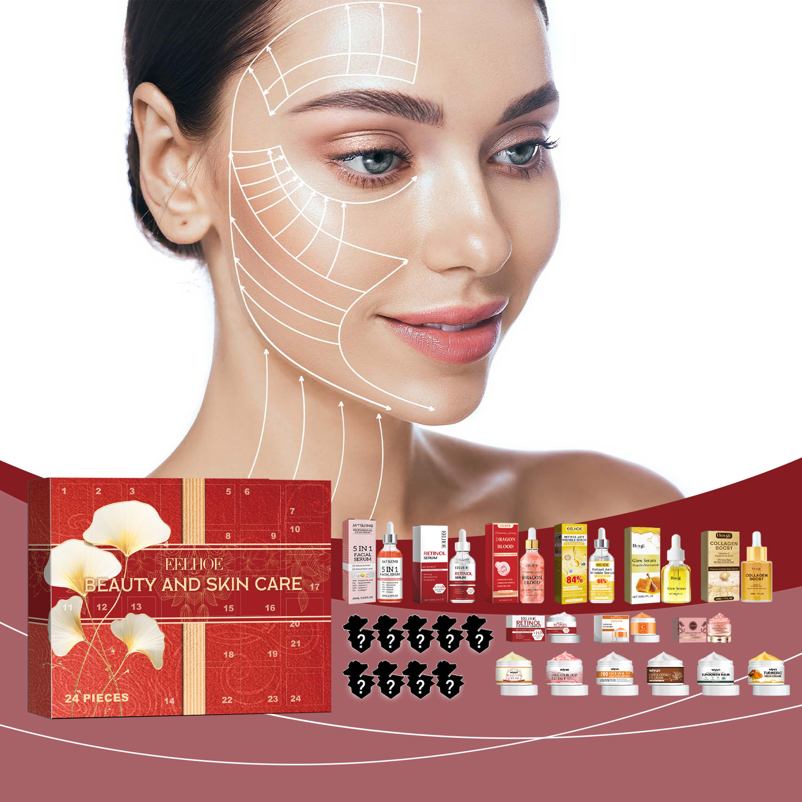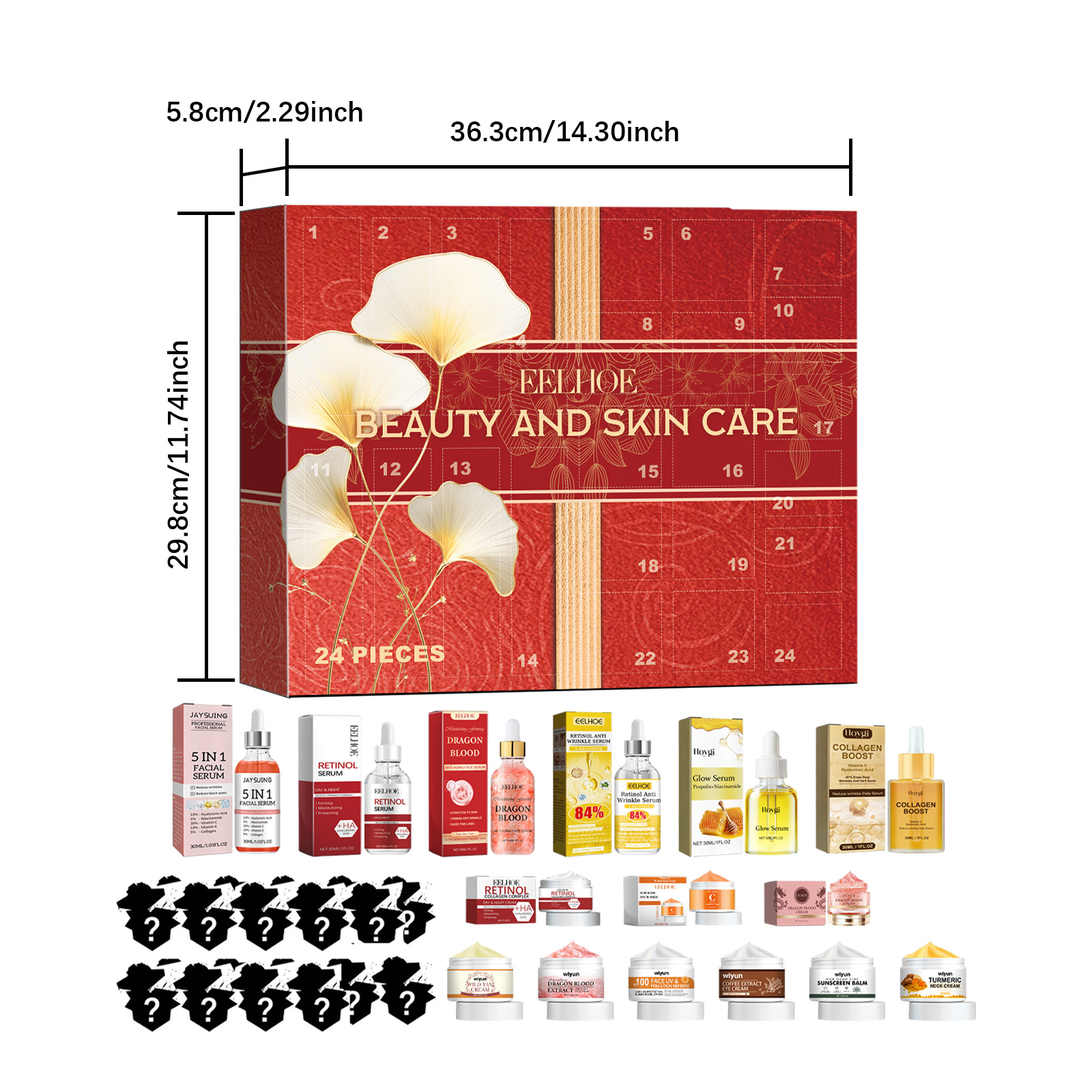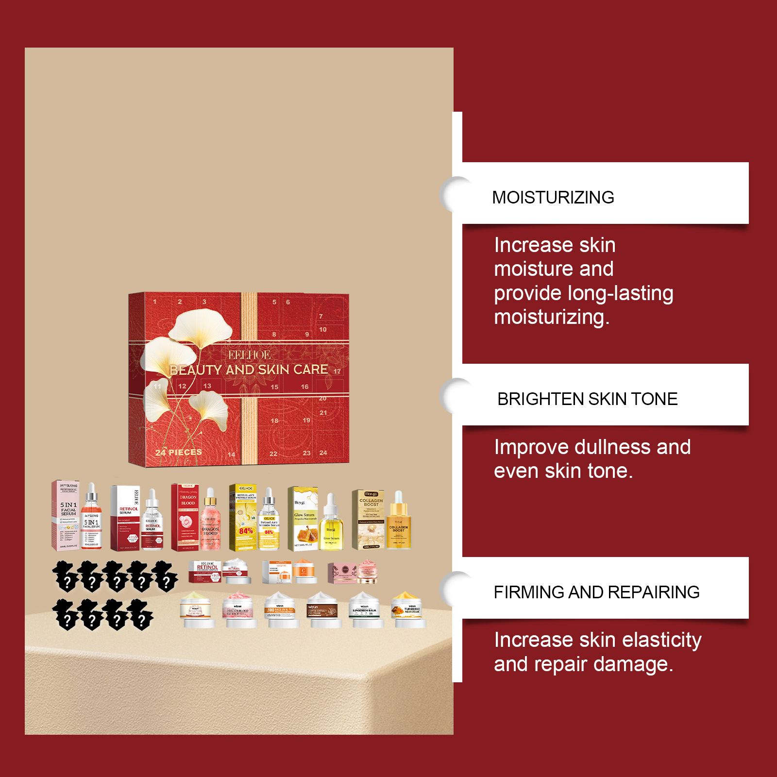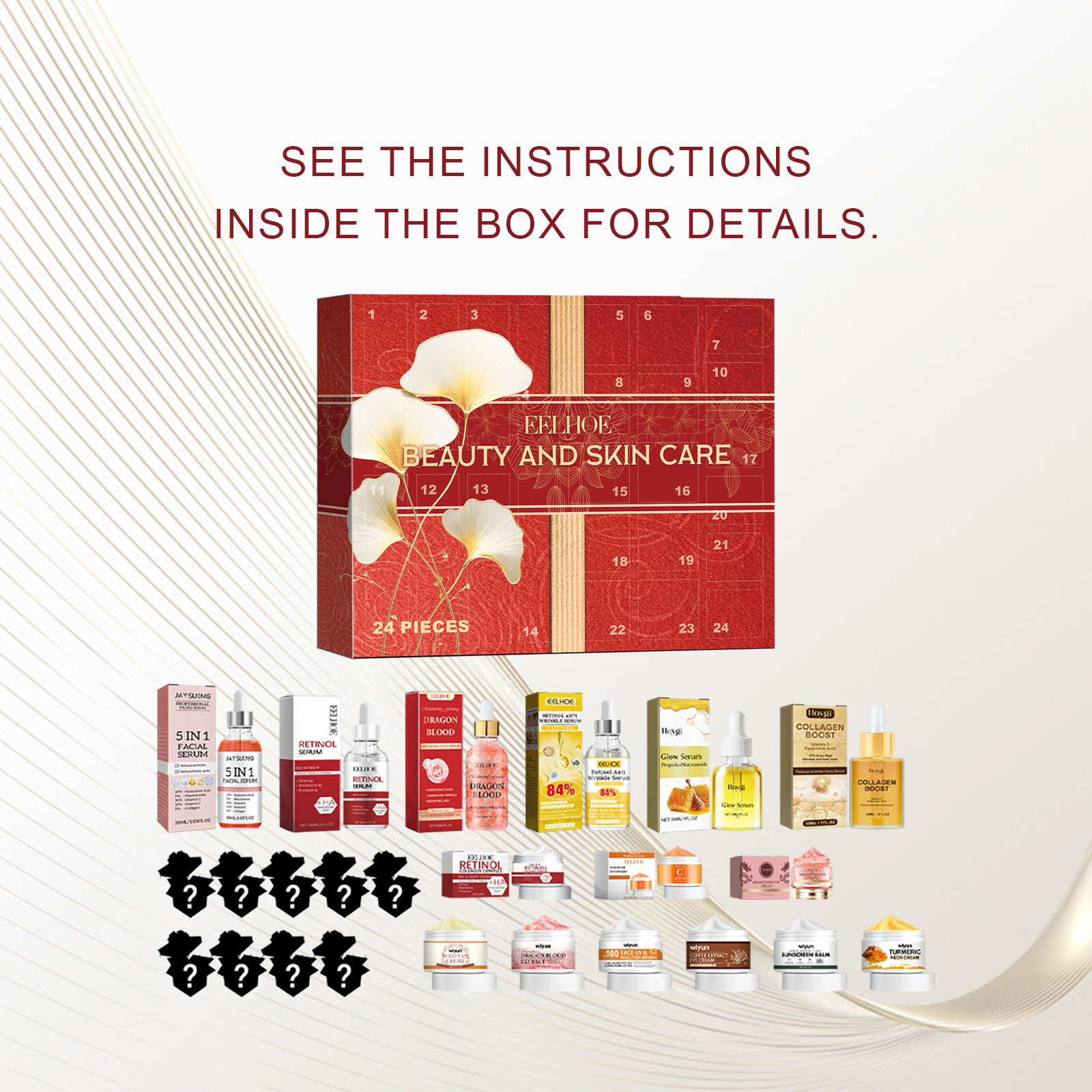 Our 24 boxes contain vitamin C, sodium hyaluronate, niacinamide. It adds moisture to the skin and provides lasting hydration. Improves dullness and even skin tone. Increase skin elasticity and repair damage. The way to use it is simple: choose your favorite number, open the box, and enjoy the Christmas surprise. Add to the Christmas atmosphere and bring surprises. Select high quality ingredients to provide comprehensive skin care.