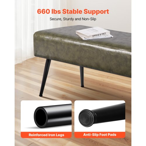 PU Leather Bedroom Bench with Metal Legs Shoe Bench for Entryway Green<br/>Premium Leather Upholstery<br/>Sturdy Leg Support<br/>High-Density Sponge Cushioning<br/>Versatile for Any Space<br/>Multiple Colors & Sizes Available<br/>Easy to Clean<br/>Seat Cushion Thickness: 6.7 in / 170 mm,Leg Material: Iron,Materials: Leather + Sponge + Iron Tubes + Engineered Wood,Dimensions: D x W x H: 15.7 x 43.3 x 16.9 in / 400 x 1100 x 430 mm,Main Color: Green,Weight Capacity: 660 lbs / 300 kg,Item Model Number: CWD0016CA-KD-GREEN,Surface Treatment: Black Powder Coating,Leg Color: Black,Seat Cushion: 50 mm / 2 in Thick, D28 Foam,Net Weight: 18.1 lbs / 8.2 kg (including all accessories),Fabric: PU Leather,Side Cushions: D20 + D16 Foam