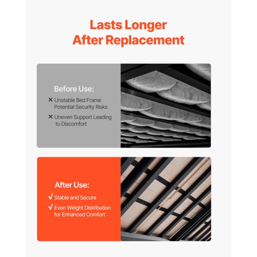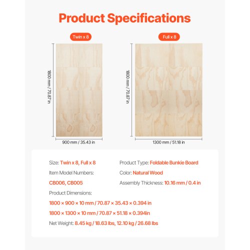 VEVOR Full Size Bunkie Board, 0.4 in Foldable Bed Board Slats with Connection, Wooden Mattress Support for Full Size Bed, Support Under Mattress Boards, Ready to Use, 8 Piece, BurlywoodReady to UseReliable SupportEasy InstallationIdeal FitWide CompatibilityUnmatched DurabilityNumber of Pieces: 8,Size: Full,Color: Natural Wood,Item Model Number: CB005,Product Weight: 26.68 lbs / 12.10 kg,Product Dimensions (L x W x H): 70.87 x 51.18 x 0.394 in / 1800 x 1300 x 10 mm,Assembly Thickness: 0.4 inch (10.16 mm),Connection Method: Webbing Connection