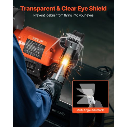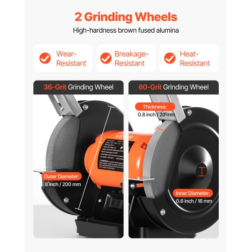 VEVOR Bench Grinder 8-inch Bench Grinder 550W 3450RPM High-Speed Table Grinders<br/>High-Speed Grinding Power<br/>2-Wheel Setup<br/>Heavy-Duty Stability<br/>User-Friendly Design<br/>Efficient Grinding Performance<br/>High-Quality Motor<br/>Color: Orange + Black,Grinding Wheel Outer Diameter: 8 inch / 200mm,Grinding Wheel Material: Brown Fused Alumina,Product Dimensions: 15.8 x 9.8 x 11.8 inch / 400 x 250 x 300 mm,Body Material: Steel Plate,Rated Speed: 3450RPM ,Voltage: AC120V 60Hz ,Grinding Wheel Grit: 36-Grit (Left) / 60-Grit (Right) ,Item Model Number: MD200G-550,Rated Power: 550W,Rated Current: 4.5A,Net Weight: 25.8 lbs / 11.72 kg,Base Material: Die-Cast Aluminum