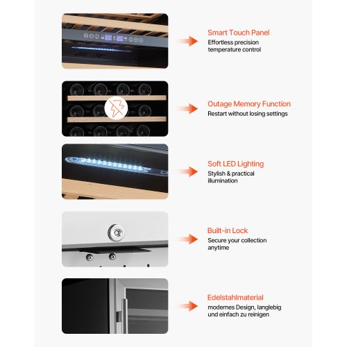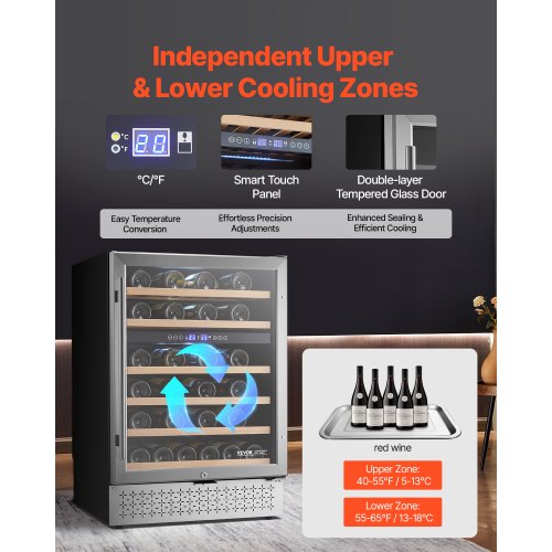 Wine Cooler 46 Bottle Dual Zone Wine Refrigerator with Glass Door Temp ControlBuilt-in Wine CoolerPowerful Cooling SystemLow-noise & High-performanceFlexible InstallationVersatile for Any VenueEasy Touch, Precise ControlTemperature Control: Electronic Control,Item Dimensions (Without Handle): 23.46" x 22.6" x 34.3" / 595 x 575 x 870 mm,Configuration: Single Door, Double Zones,Key Feature: Wine Storage,Cooling Method: Air Cooling,Item Model Number: YC-150B,Maximum Capacity: 46 Bottles,Glass Type: Standard Tempered Glass,Item Dimensions (With Handle): 23.46" x 24.4" x 34.3" / 595 x 620 x 870 mm,Door Type: Stainless Steel Frame + Stainless Steel Handle,Adjustable Shelves: 6,Item Weight: 103.52 lbs / 47 kg