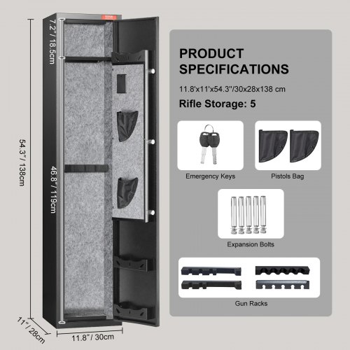 VEVOR 5 Rifles Gun Safe, Rifle Safe with Fingerprint Lock, Quick Access Gun Storage Cabinet for Shotguns with Removable Shelf, Pistol Rack, Ammo Storage Box for Home Long Gun and PistolsMaximize StorageMaximize SecurityBiometric Fingerprint LockRobust ConstructionAnti-Theft DesignEasy AccessMounting Hole: bottom: 4; back: 6,Bullet Storage Box: 7.5''x2.4''/190x60mm,Bolts: 3,Material: Q235 Cold-rolled Steel Sheet,Door Plate Thickness: 0.07''/1.8mm,Pistol Placing Rack: 11.8''x1.2''/300x30 mm, Removable,Placing Rack: 11.8''x1.2''/300x30 mm, Adjustable,Code: 3-12 Digits,Working Power Supply: 4 PCS AA batteries,Cabinet Wall Thickness: 0.04 "/1.1mm,Product Size: 11.8''x11''x54.3''/300x280x1380 mm,Storage Capacity: 5,Automatic Lock: YES