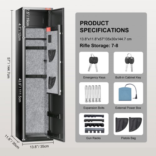 VEVOR 6 Rifles Gun Safe, Rifle Safe with Digital Keypad & Lock, Gun Storage Cabinet for Shotguns with Built-in Storage Locker, Removable Storage Shelf for Home Long Gun and PistolsBiometric LockMaximize SecurityTouchscreen Keypad LockRobust ConstructionAnti-Theft DesignEasy AccessMounting Hole: bottom: 4; back: 6,Bullet Storage Box: 9.7''x2.4''/247x60mm,Bolts: 3,Material: Q235 Cold-rolled Steel Sheet,Door Plate Thickness: 0.07''/1.8mm,Pistol Placing Rack: 13.8''x1.3''/350x30 mm, Removable,Placing Rack: 13.8''x1.3''/350x30 mm, Adjustable,Code: 3-12 Digits,Working Power Supply: 4 PCS AA batteries,Cabinet Wall Thickness: 0.04 "/1.1mm,Product Size: 14.1''x14''x57''/360x355x1447 mm,Storage Capacity: 6,Automatic Lock: YES