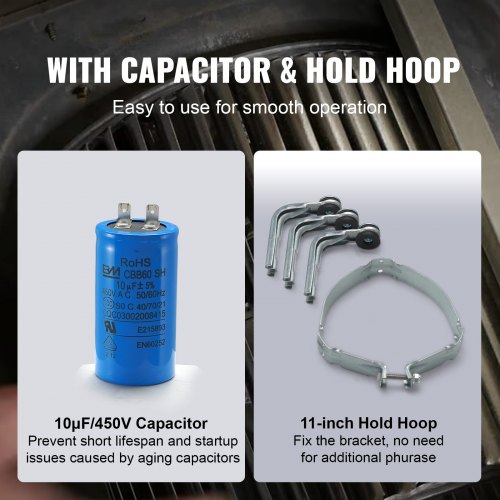 VEVOR 3/4HP Furnace Blower Motor, 208/230V 3.85Amps, 1075RPM 5 Speeds, CW/CCW Rotation, 48 Frame 4.8" Shaft Length, 10μF/450V Capacitor + 11" Hold Hoop3/4HP Furnace Blower MotorConvenient AccessoriesDurable MaterialDual RotationWide Applications10μF/450V CapacitorShaft Length: 4.8",Horsepower: 3/4HP,Voltage: 208-230V,Frequency: 60Hz,Shaft Diameter: 0.5",Rated Current: 3.85A,Number of Speeds: 5,Rotation: CW / CCW,Rotation Speed: 1075RPM,Frame Size: 48