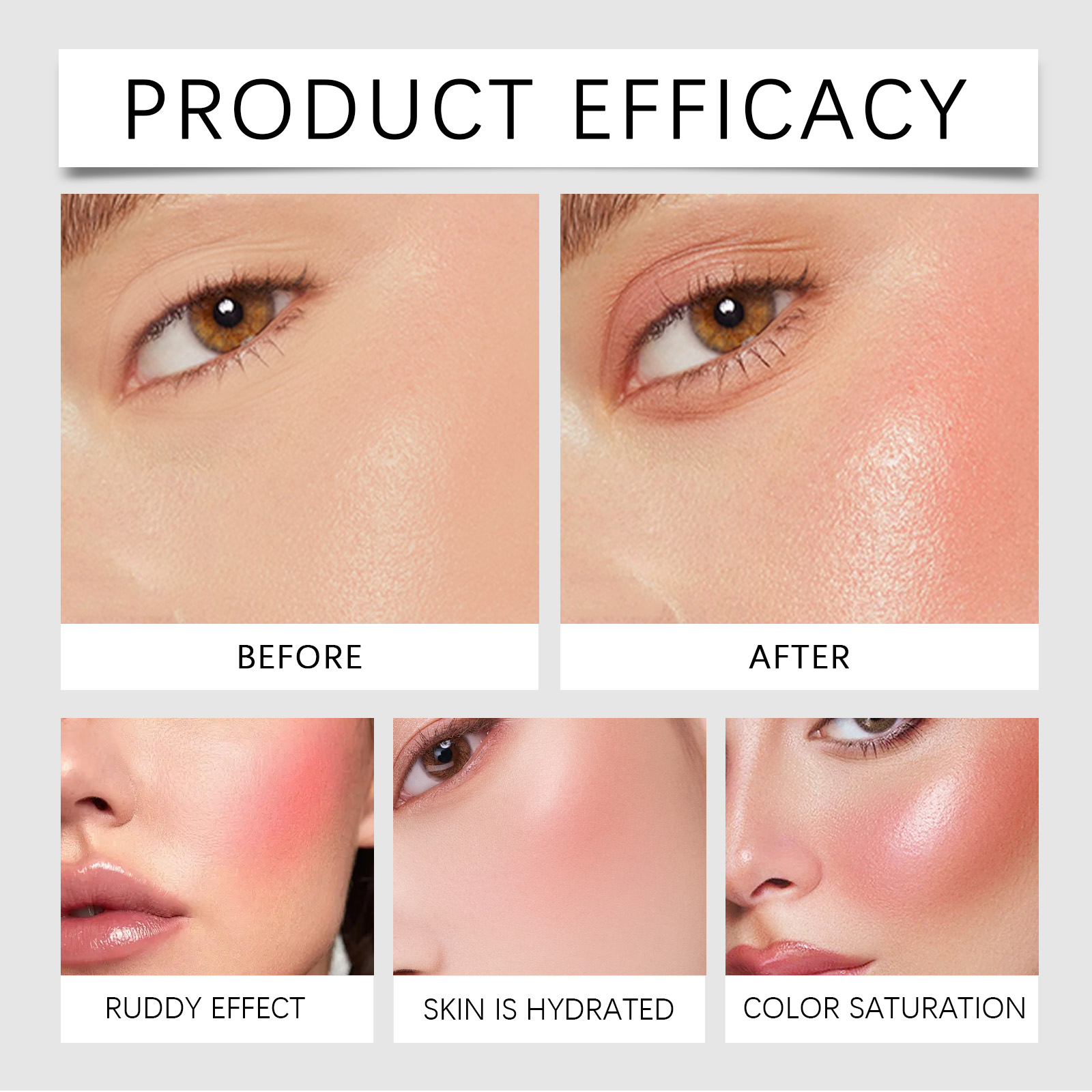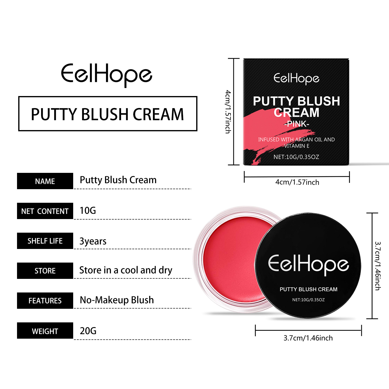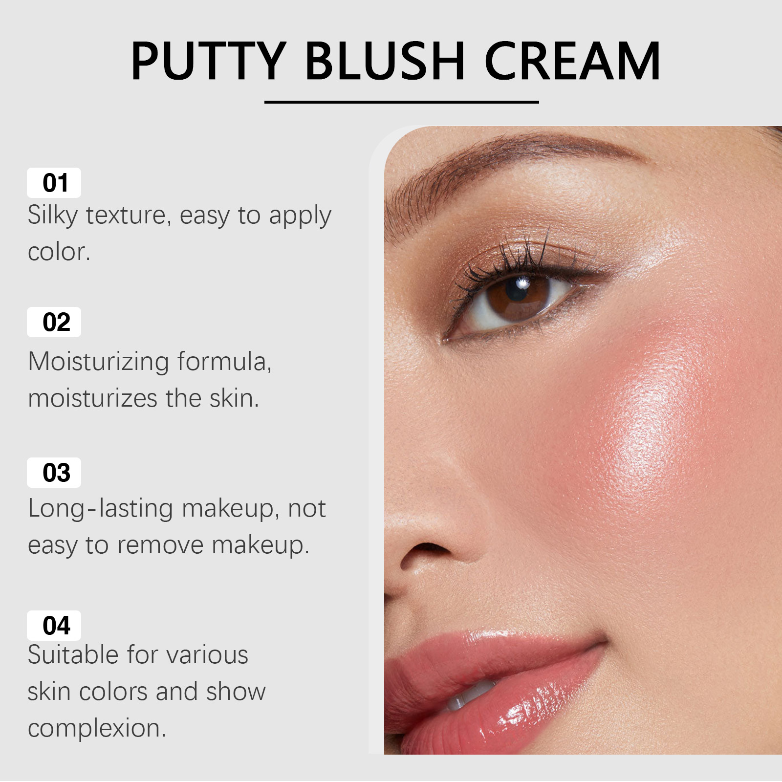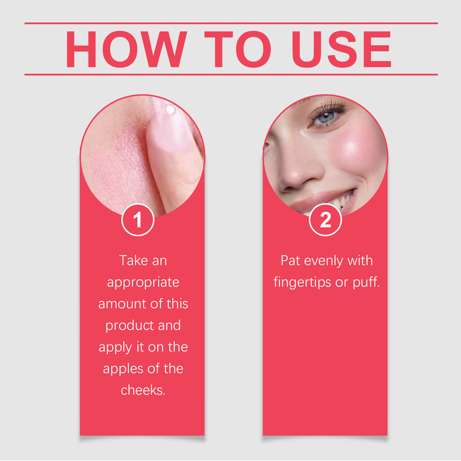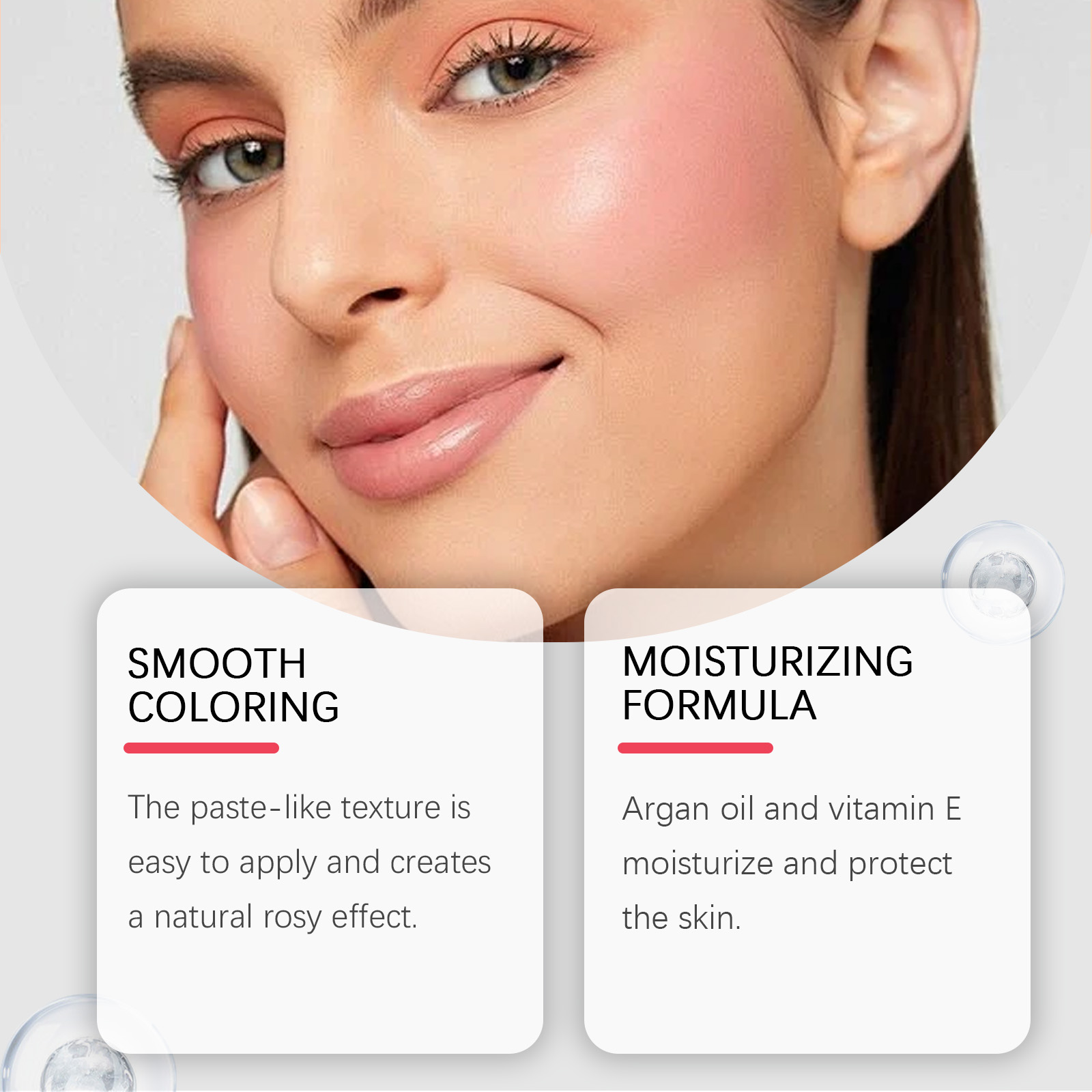 Our pink blush paste contains hyaluronic acid and iron oxide. It moisturizes and protects the skin. The way to use it is very simple: take a proper amount of this product and apply it to the apples of your cheeks. Pat or puff evenly with your fingertips. And easy to apply to create a natural rosy effect.