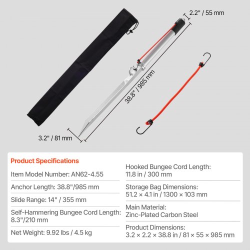 Sand Spike Boat Anchor Slide Anchor Shore Spike 36 in for Shallow Water<br/>No More Drifting<br/>Great for Shallow Waters<br/>Tie-Off Rings for Boats<br/>For Fresh or Salt Water<br/>Easy to Store and Transport<br/>How to Use the Spike Anchor?<br/>Slide Range: 14 in / 355 mm,Self-Hammer Bungee Cord Length: 8.3 in / 210 mm,Item Model Number: AN62-4.55,Anchor Length: 38.8 in / 985 mm,Storage Bag Dimensions: 51.2 x 4.1 in / 1300 x 103 mm,Product Dimensions: 3.2 x 2.2 x 38.8 in / 81 x 55 x 985 mm,Net Weight: 9.9 lbs / 4.5 kg,Hooked Bungee Cord Length: 11.8 in / 300 mm,Main Material: Galvanized Carbon Steel