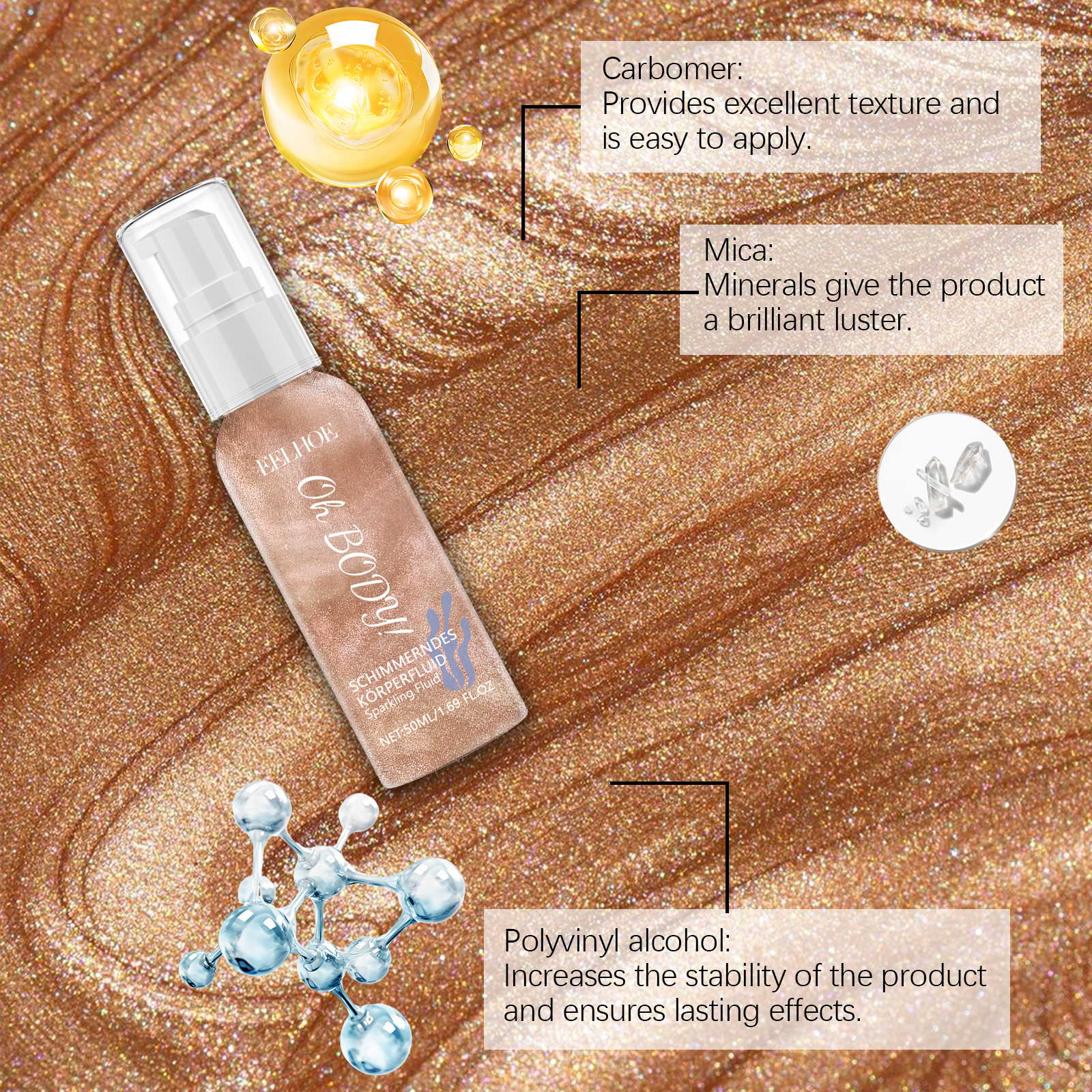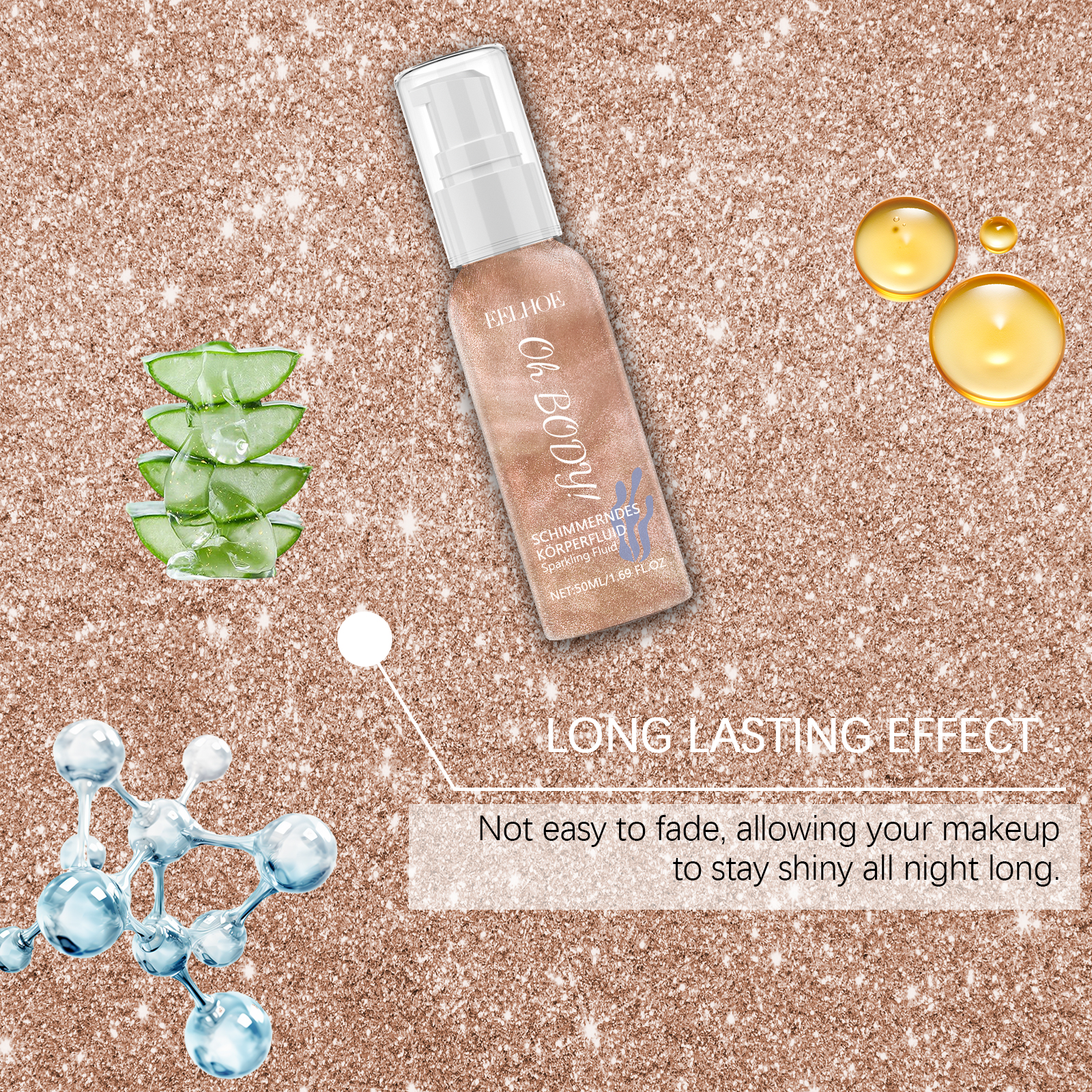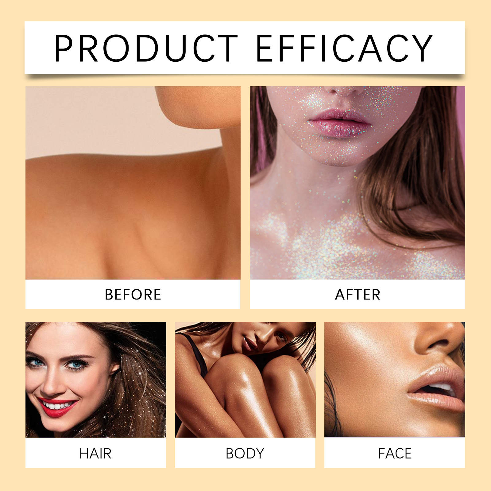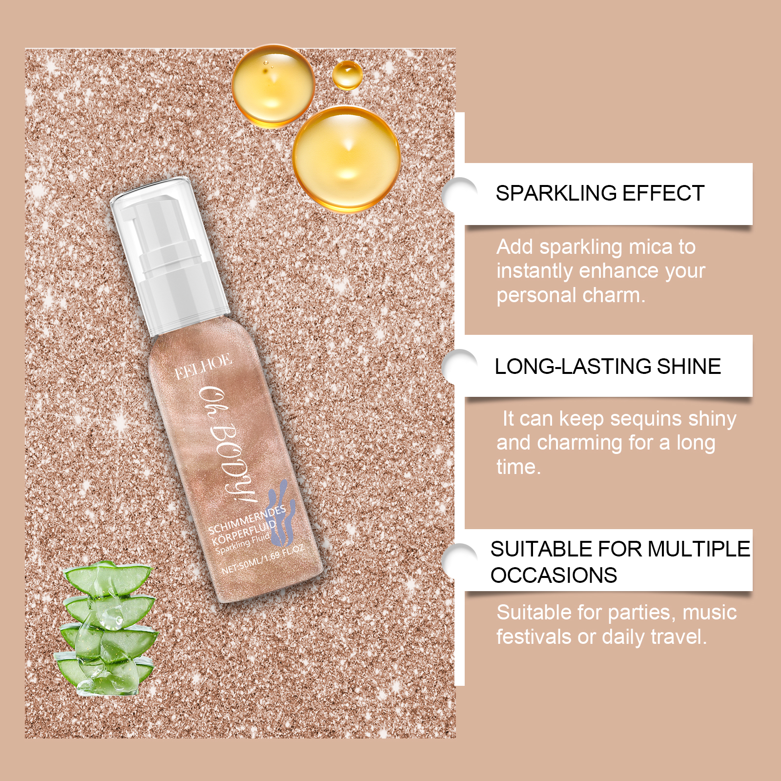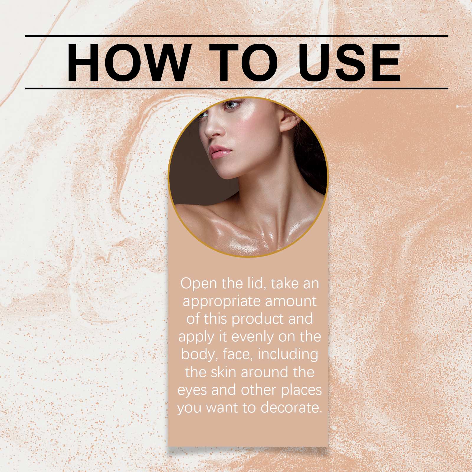 Our shiny body lotion contains glycerin, carbomer, mica. It can instantly boost your charisma. It can keep the sequins shiny and attractive for a long time. Perfect for parties, music festivals or daily trips. Its use method is very simple: open the bottle cap, take appropriate amount of this product evenly apply to the body, face, including around the eyes and other parts you want to decorate. Non-stick formula, comfortable experience. Suitable for face and body. Easy to wash off, no special detergent required.