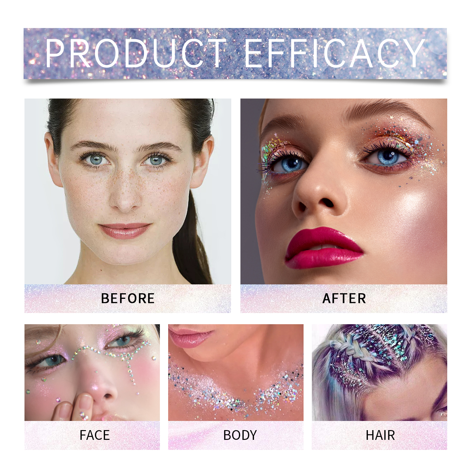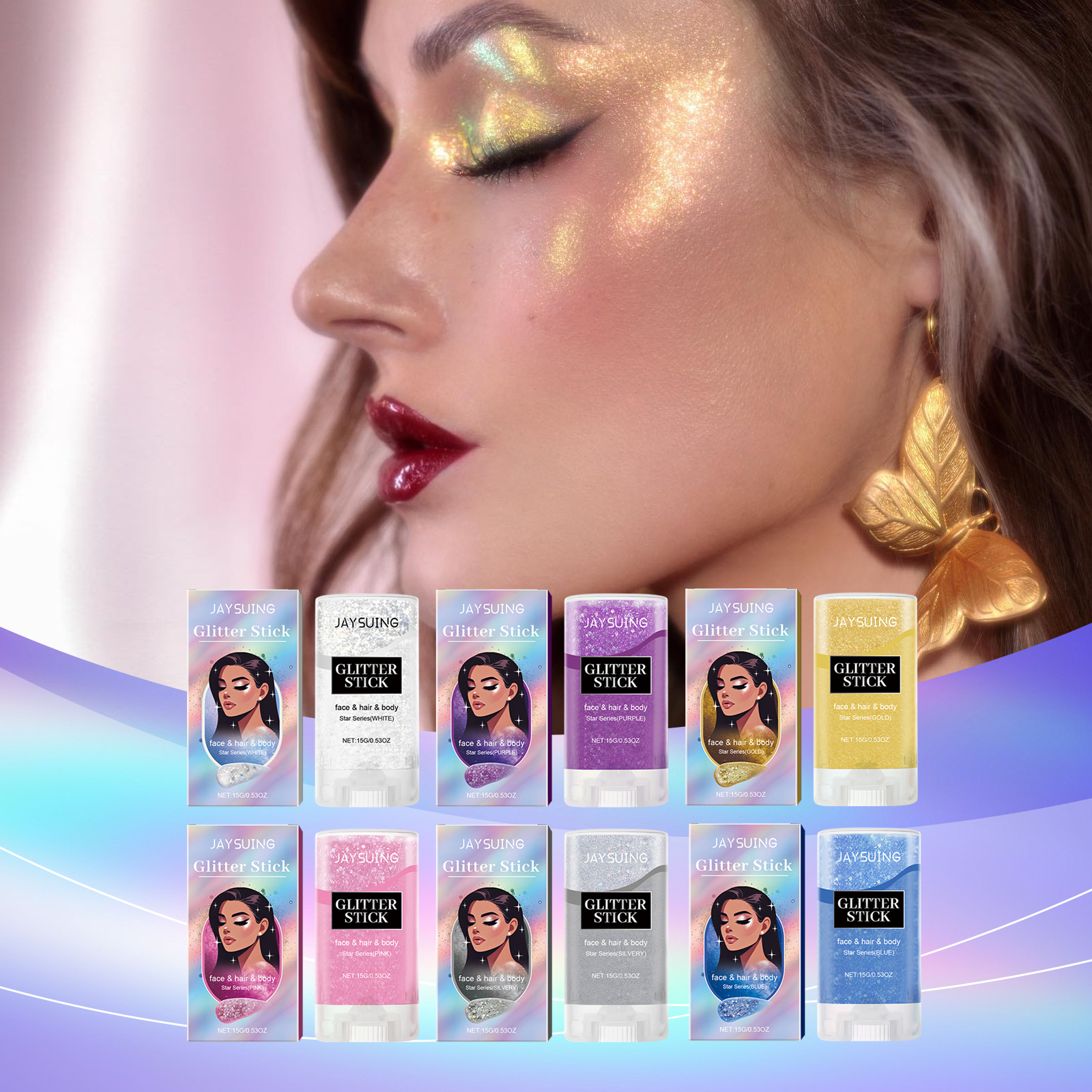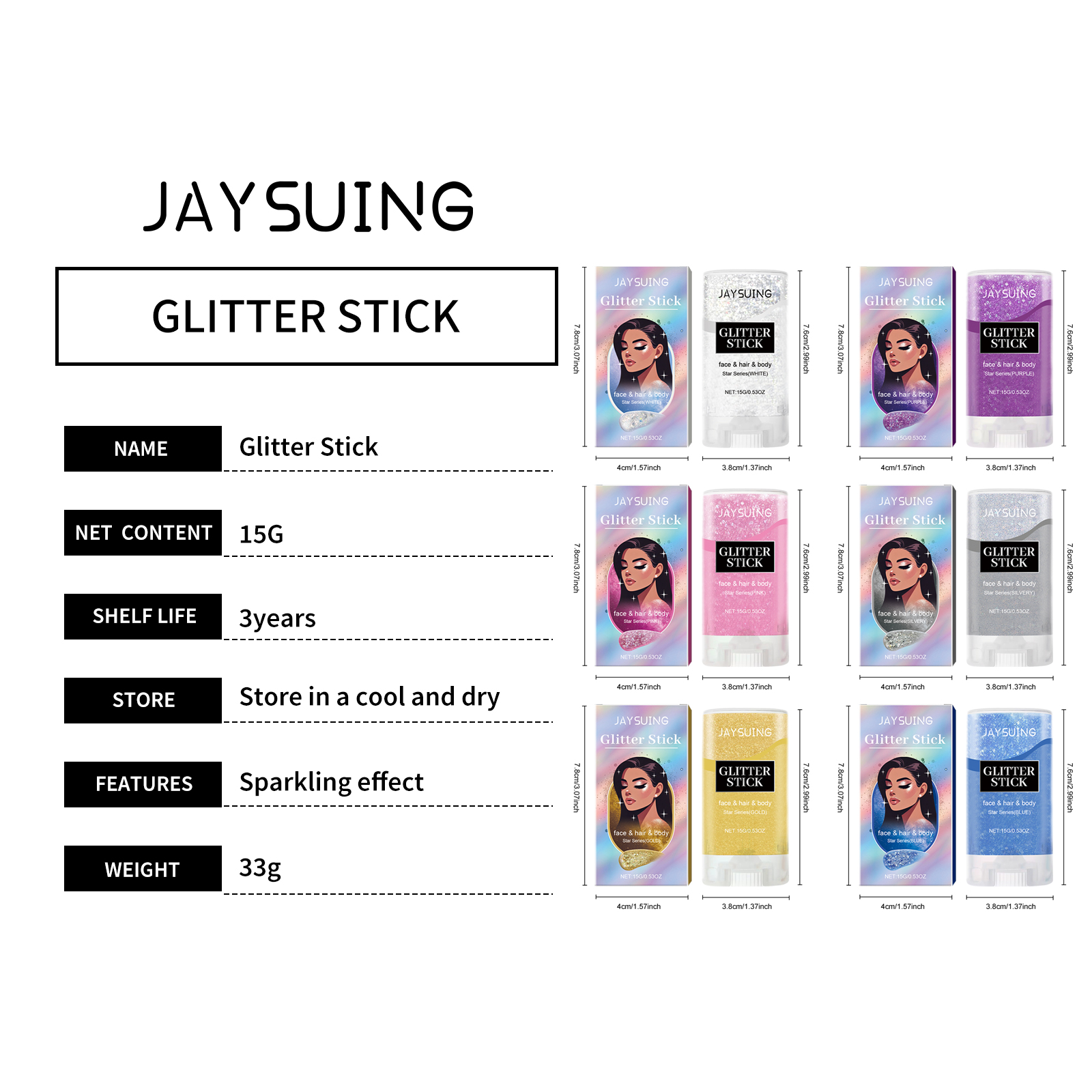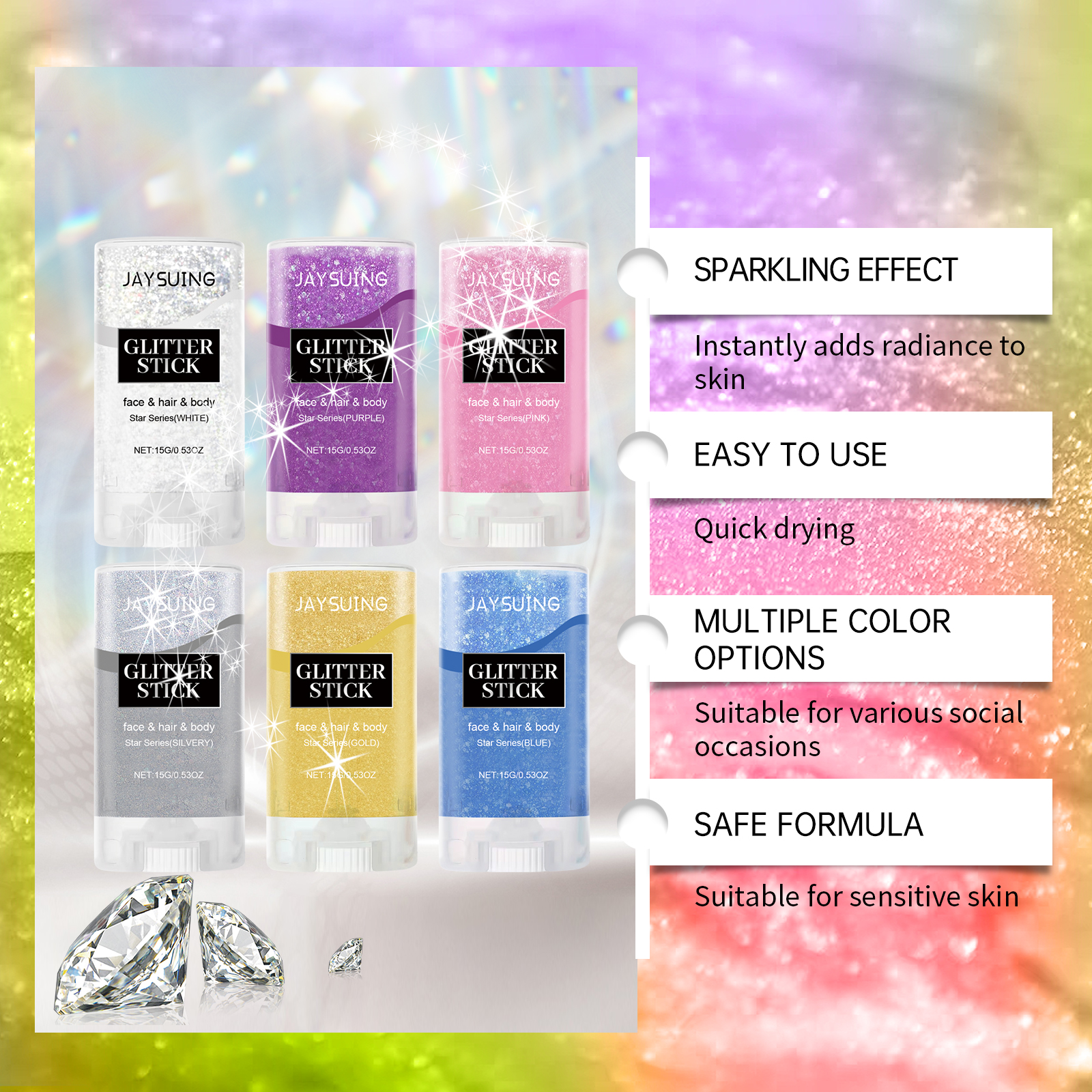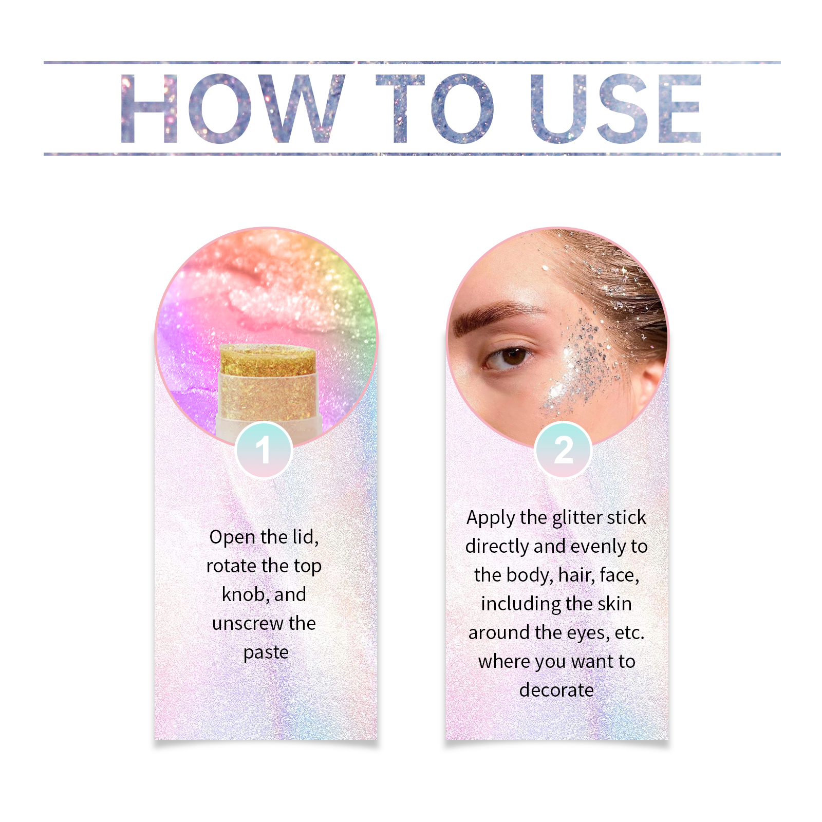Our glitter sticks contain glycerin, carbomer, mica. He can instantly increase skin shine and keep the glitter shiny and attractive for a long time. Its use method is very simple: 1. Open the lid, turn the top knob, unscrew the paste; 2. Apply the glitter stick directly and evenly on the body, hair, face, including the skin around the eyes and other parts you want to decorate. Add sparkling mica to instantly enhance your personal charm; Suitable for all social occasions, suitable for sensitive skin.