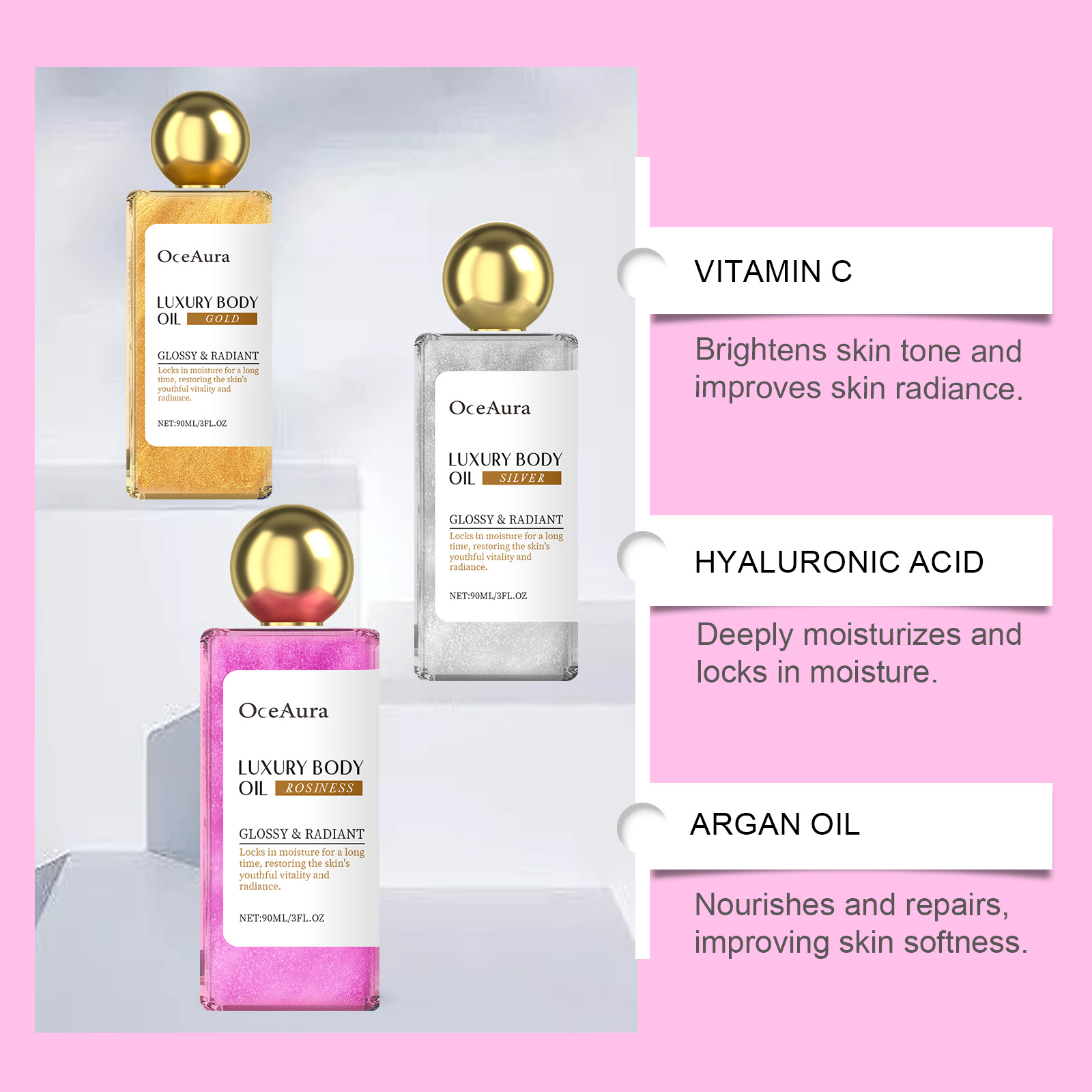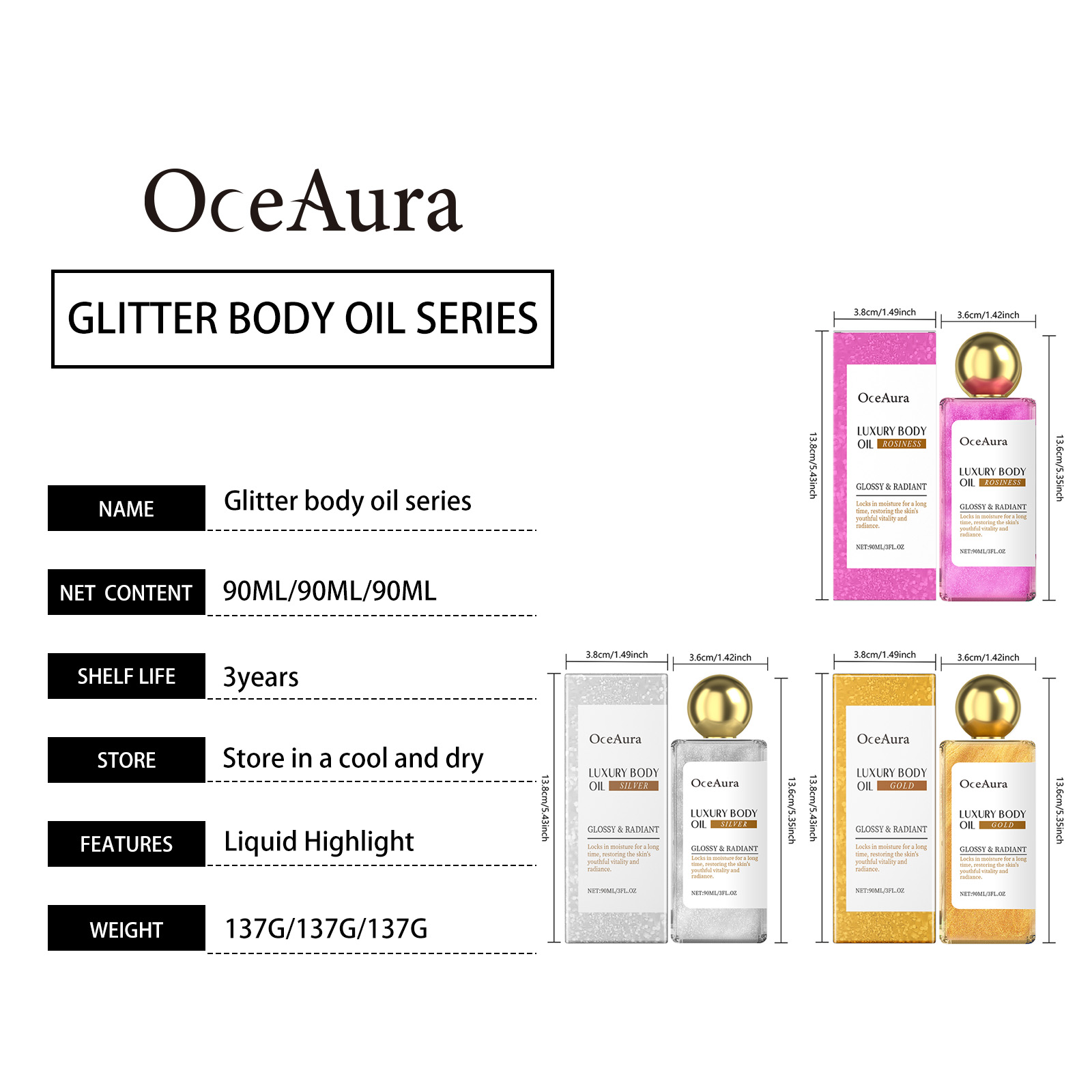OceAura Shimmer Body Oil Series Deep Moisturizing Facial Body Skin Daily Massage Care Oil