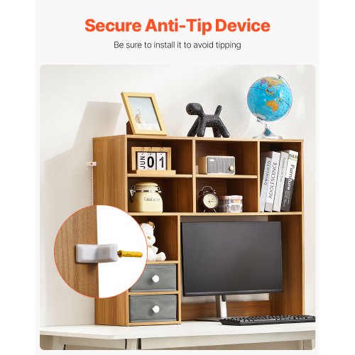 Desktop Bookshelf Wood Desktop Storage Organizer 3-Tier for Office & HomeDesktop BookshelfOrganized StorageSturdy and DurableQuick and Easy SetupVersatile for Various SpacesScrew Hole Covers IncludedFabric Drawer Compartment: 9.8" x 4.6" / 24.9 x 11.7 cm,Two fabric drawers:,Back Panel Thickness: 0.1" / 3 mm,Color: Wood Color,Small Compartment: 9.8" x 7.6" / 24.9 x 19.3 cm,Shelf Board Thickness: 0.5" / 12 mm,Product Size: 37.0" x 10.0" x 31.1" / 94 x 25.4 x 79.2 cm,Number of Shelves: 3,Large Compartment: 12.9" x 12.2" / 32.8 x 31 cm,Other Details:,Weight Capacity: 100 lbs / 45 kg,Shelf Dimensions:,Anti-slip feet pads:,Item Model Number: KLBS-12,Vertical Board Thickness: 0.6" / 15 mm,Anti-tip accessories:,Net Weight: 33.6 lbs / 15.25 kg,Main Material: Particle Board + Melamine Paper