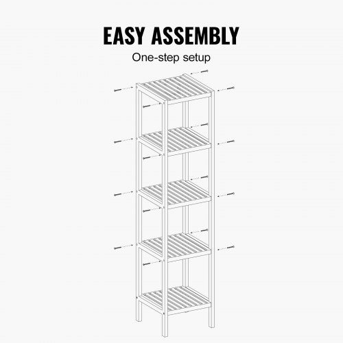 VEVOR 5-Tier Bathroom Standing Shelf, Rattan Shelf, Narrow Shelving Unit, Display Storage Rack Organizer, Freestanding Flower Plant Stand, Multifunctional Bamboo Shelf Ideal for Bathroom, Kitchen, Home, NaturalOpen StorageSturdy & DurableSafety ProtectionQuick AssemblyVersatile UseUser-Friendly MaterialsThickness: Long Piece 1.30 x 0.59 inch / 33 x 15 mm, Short Piece 1.30 x 0.47 inch / 33 x 12 mm,Weight Capacity: 22 lbs per Layer,Shelf Dimensions: 12.80 x 11.81 x 0.98 inch / 325 x 300 x 25 mm,Color: Bamboo Natural Color,Item Model Number: OPX-BCB55N,Product Weight: 11.02 lbs / 5 kg,Material: Nan Bamboo,Frame Dimensions: 57.68 x 12.99 x 0.59 inch / 1465 x 330 x 15 mm,Product Dimensions: 12.99 x 12.99 x 57.87 inch / 330 x 330 x 1470 mm,Layers: 5