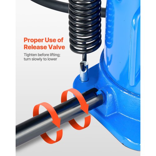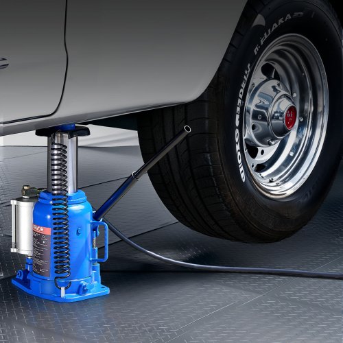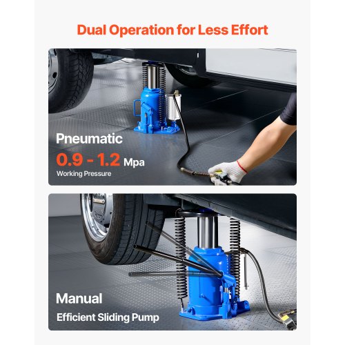 VEVOR Air Hydraulic Bottle Jack, 32 Ton (70546.9 lbs) Capacity, 10-16.3 Inch Lifting Range, Pneumatic/Manual Heavy Duty Welded Bottle Jack with Pump for Car, SUV, Pickup, Truck, RV, Auto Repair, Blue<br/>Anti-Slip Saddle<br/>Seamless Connection<br/>Thick & Wide Base<br/>2 Ways to Pump<br/>Medium Lifting Range<br/>Reliable Details<br/>Main Materials: Cast Iron, Carbon Steel,Item Model Number: MR8006-1,Working Air Pressure: 0.9-1.2 MPa,Product Weight: 42.6 lbs/19.3 kg,Product Dimensions: 10.4 x 7.7 x 10.0 in/265 x 195 x 255 mm,Lifting Range: 10.0-16.3 in/255-415 mm,Rated Load: 70546.9 lbs/32 t
