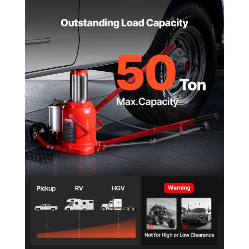 VEVOR Air Hydraulic Bottle Jack High Lift Jack 50 Ton (110231.5 lbs) Car Repair<br/>Anti-Slip Saddle<br/>Seamless Connection<br/>Thick & Wide Base<br/>2 Ways to Pump<br/>Medium Lifting Range<br/>Reliable Details<br/>Main Materials: Cast Iron, Carbon Steel,Item Model Number: MR8008,Working Air Pressure: 0.9-1.2 MPa,Product Weight: 65.5 lbs/29.7 kg,Product Dimensions: 15.6 x 9.1 x 10.4 in/395 x 230 x 265 mm,Lifting Range: 10.4-16.1 in/265-410 mm,Rated Load: 110231.5 lbs/50 t