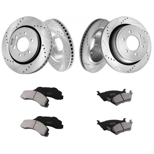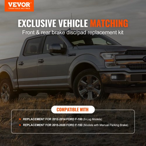 VEVOR Drilled Slotted Front&Rear Brake Rotors Pads Kit for 2012-2020 Ford F-150translatortranslatortranslatortranslatortranslatortranslatortranslatorCompatible Vehicle Models: 2012-2014 Ford F-150 (6-Lug Models), 2015-2020 Ford F-150 (Models with Manual Parking Brake),Brake Rotor Size: Φ13.8×2.0 inch/350×49.6 mm (Front), Φ13.7×3.1 inch/348.2×79.6 mm (Rear),Item Model Number: 54153/21373,Product Weight: 116.4 lbs/52.8 kg,Brake Pad Size: 7.6×2.7×0.7 inch/194×68×18.5 mm (Front), 5.9×2.1×0.6 inch/149×54×16 mm (Rear),Brake Pad Part Number: P-1414 (Front), P-1602 (Rear),Main Material: Brake Disc: Cast Iron (HT250), Brake Pad: Ceramic,Brake Rotor Part Number: S-54153 (Front), S-54186 (Rear)