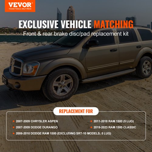 VEVOR Drilled Slotted Front and Rear Brake Rotors Pads Kit for Dodge Ram 1500translatortranslatortranslatortranslatortranslatortranslatortranslatorCompatible Vehicle Models: 2006-2010 Dodge Ram 1500 (Excluding SRT-10 Models; 5 Lug), 2011-2018 Ram 1500 (5 Lug), 2019-2023 Ram 1500 Classic, 2007-2009 Chrysler Aspen, and 2007-2009 Dodge Durango,Brake Rotor Size: Φ13.2×2.7 inch/335.8×67.5 mm (Front), Φ13.9×2.8 inch/Φ352×72 mm (Rear),Item Model Number: 53005/53006,Product Weight: 101.4 lbs/46 kg,Brake Pad Size: 7.0×2.4×0.7 inch/177.8×61×18 mm (Front), 6.5×1.9×0.6 inch/166×49×16.5 mm (Rear),Brake Pad Part Number: P-1084 (Front), P-967 (Rear),Main Material: Brake Disc: Cast Iron (HT250), Brake Pad: Ceramic,Brake Rotor Part Number: S-53005 (Front), S-53006 (Rear)
