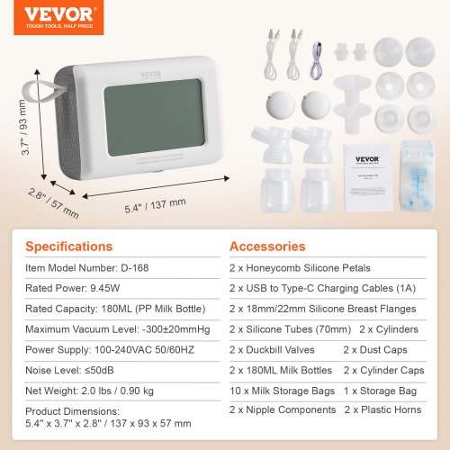 VEVOR Breast Pump, Single/Double Adjustable Electric Breast Pumps, 4 Modes & 9/15 Levels, Reciprocating Piston Pumps, 4000mAH Anti-Backflow Breastfeeding Pump with 300mmHg High Suction, 18/22mm FlangePersonalized Pumping ComfortEfficient and IntelligentSkin-Friendly DesignDiscreet and Quiet OperationEffortless and ConvenientLongtime Pumping ConfidenceNoise Level: ≤50dB,Rated Capacity: 180ML (PP Milk Bottle),Maximum Vacuum Level: -300±20mmHg,Item Model Number: D-168,Rated Power: 9.45W,Product Dimensions: 5.4'' x 3.7'' x 2.8'' / 137 x 93 x 57 mm,Net Weight: 2.0 lbs / 0.90 kg