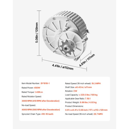 450W Electric Brushed DC Motor Kit 36V 3000rpm Motor with Upgraded ControllerFeel the SpeedEnhance Your RideNew-Generation Controller100% Pure Copper Core MotorEfficient PerformanceHigh QualityApplicable Gear Ratio: 7.18:1,No-load Rotation Speed: 4000 RPM (560 RPM after Deceleration),Load Capacity: ≤ 220.5 lbs / 100 kg,Noise: 70 dB,Rated Rotation Speed: 3000 RPM (410 RPM after Deceleration),Item Model Number: BY1018-1,Product Weight: 8.9 lbs / 4.02 kg,Rated Power: 450W,Product Dimensions: 4.61 x 4.41 x 5.08 in / 117 x 112 x 129 mm,Rated Torque: 1.43N·m,Rotation: CW