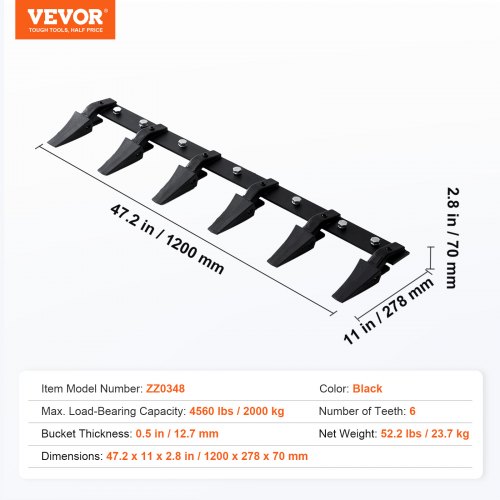 VEVOR Bucket Tooth Bar, 48'', Heavy Duty Tractor Bucket 6 Teeth Bar for Loader Tractor Skidsteer, 4560 lbs Load-Bearing Capacity Bolt On Design, for Efficient Soil Excavation and Bucket ProtectionHeavy-Duty Bucket Tooth BarEasy InstallationFully Automated Welding TechnologyHigh Strength MaterialWide ApplicationInstallation GuidelinesMax. Load-Bearing Capacity: 4560 lbs/2000 kg,Number of Teeth: 6,Color: Black,Item Model Number: ZZ0348,Dimensions: 47.2 x 11 x 2.8 in/1200 x 278 x 70 mm,Bucket Thickness: 0.5 in/12.7 mm,Net Weight: 52.2 lbs/23.7 kg
