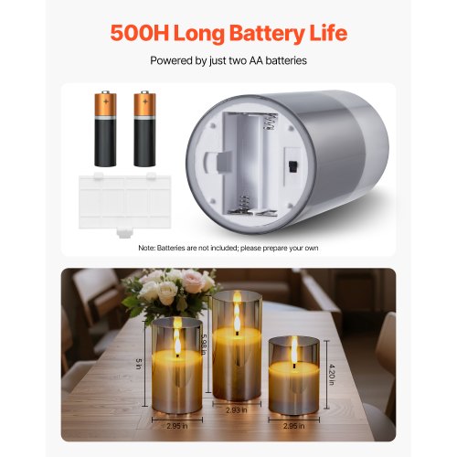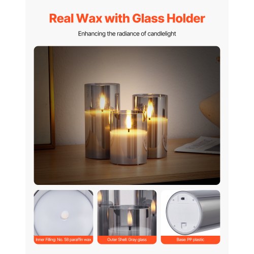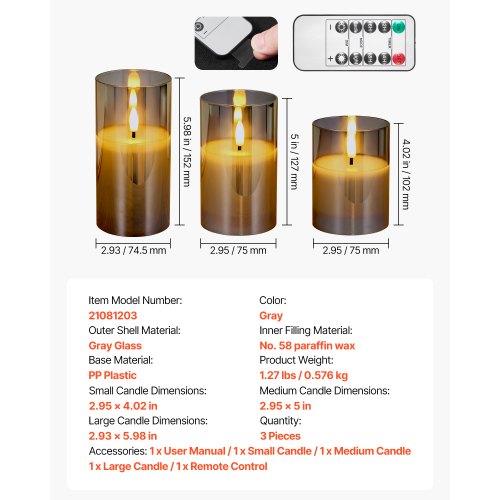 VEVOR Flameless LED Candles 3 Pack Battery Operated Candles with Remote ControlMulti-function Remote Control20-day Long Battery LifeRealistic Electronic CandleSecure UseIdeal for Every OccasionSimple & ConvenientOuter Shell Material: Gray Glass,Inner Filling Material: No. 58 Semi-Refined Paraffin Wax,Color: Gray,Item Model Number: 21081203,Product Weight: 1.27 lbs / 0.576 kg,Medium Candle Dimensions: 2.95 x 5 in / Φ75 x 127 mm,Quantity: 3 Pieces (Small Candle ×1, Medium Candle ×1, Large Candle ×1),Large Candle Dimensions: 2.93 x 5.98 in / Φ74.5 x 152 mm,Small Candle Dimensions: 2.95 x 4.02 in / Φ75 x 102 mm,Base Material: PP Plastic